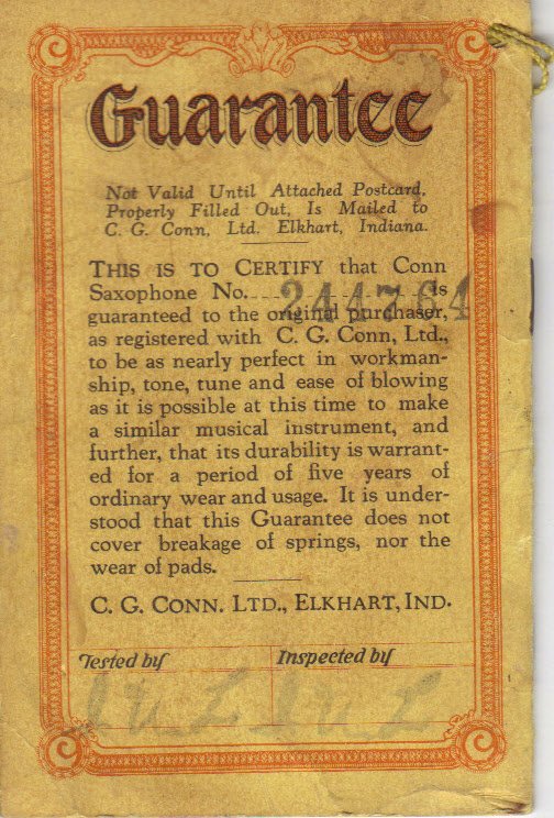 To see a Conn alto saxophone warranty booklet from 1935 (signed by the same guy!) click here.