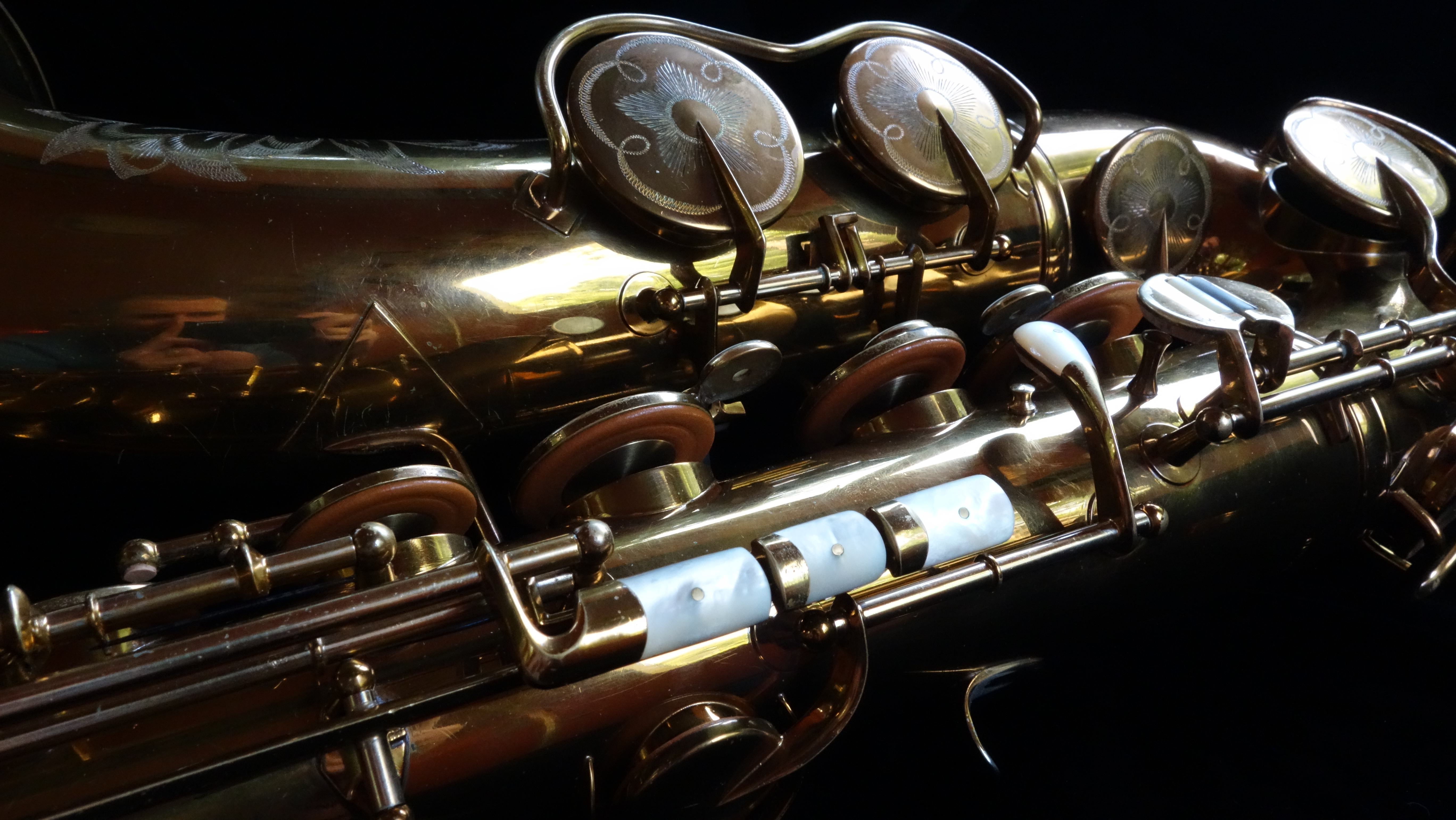 I straightened the body on this horn and overhauled it with flat metal resonators in conservative sizing and corrected some strange springwork that had been done at some point in the past. I also tried to be a bit traditional when it came to adjustment materials and so forth, wanting my work to take a far back seat to the natural beauty of the saxophone itself.
