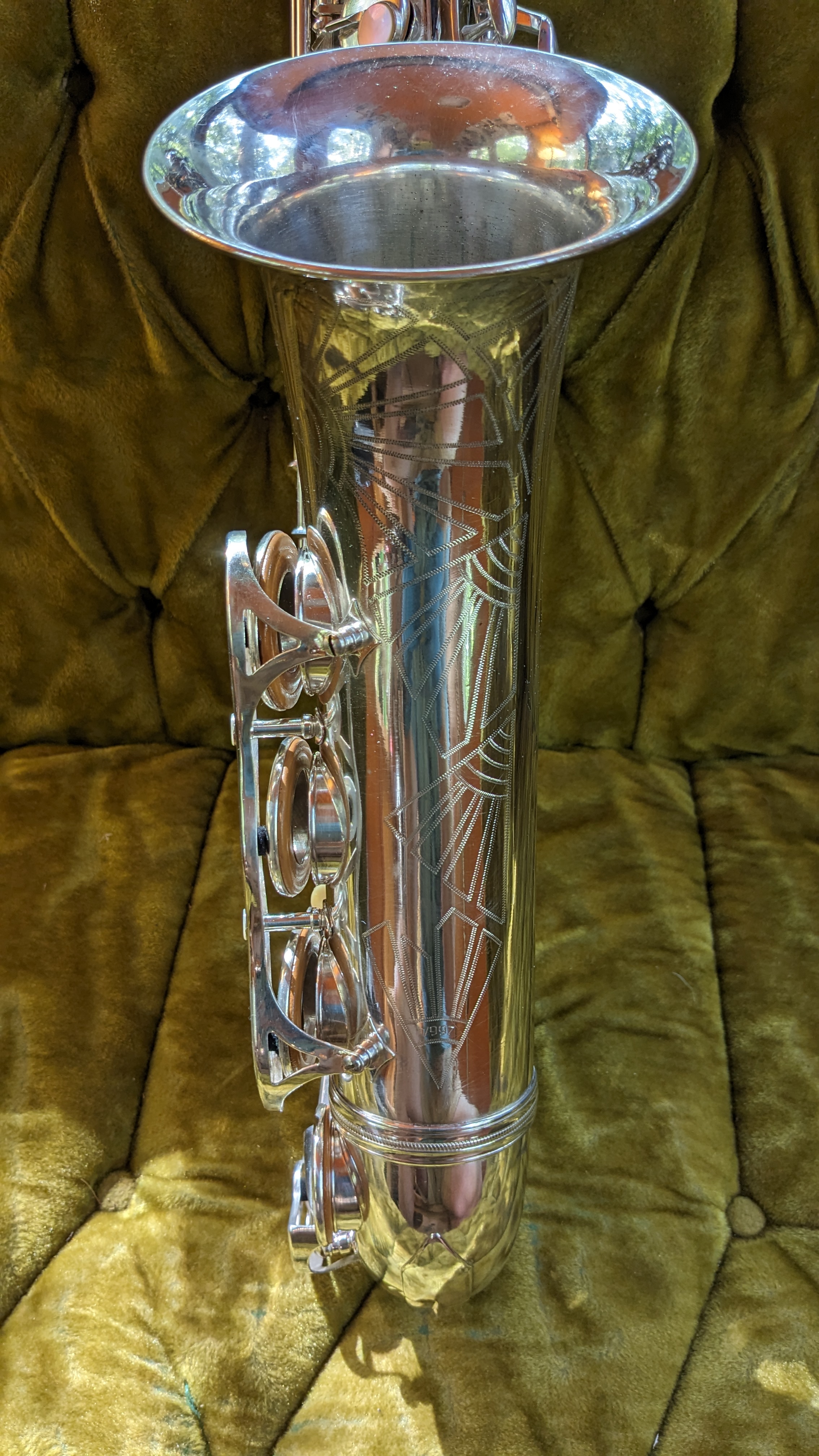 This was a very challenging overhaul. The extra range creates a lot of extra keys, and a lot of extra connections that have to be just right to feel snappy and not spongy or slow. I take pride in my work, but I would say that it is infrequent that I feel straight up proud. This is such an occasion. The keywork feels as snappy- from low A to high G- as a pristine, just overhauled 6M, and the tone is beautiful. Intonation is very good, and the horn is not only unique and rare but also eminently usable. I have become a big fan of Couesnon Monopole I and II horns over the past year or so, and this saxophone, a rare Monopole II variant, was everything I hoped it would be.