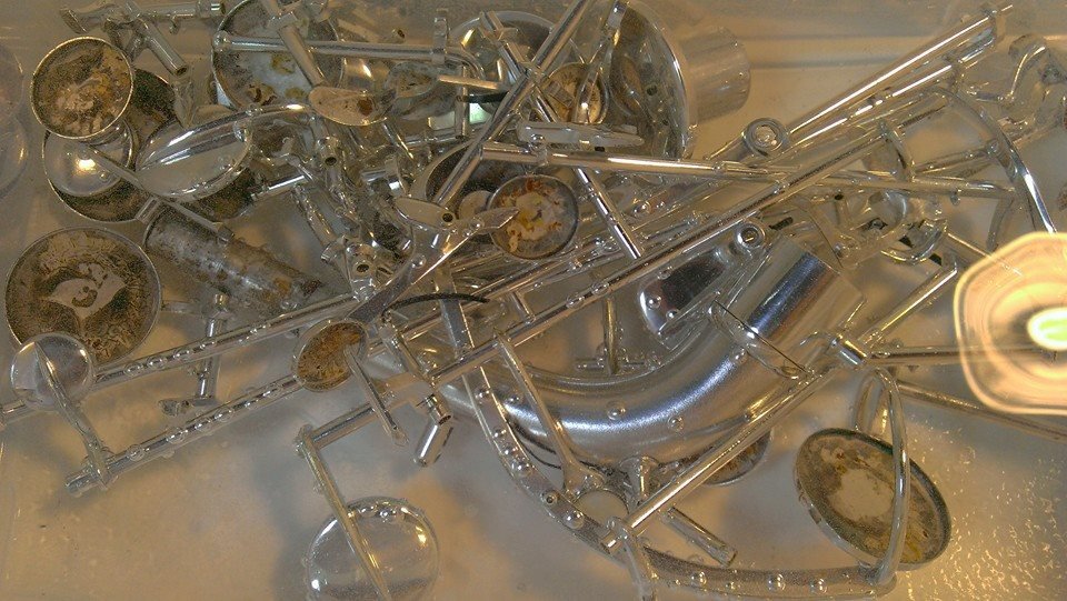Any dentwork or soldering that needs done gets done now. If the horn is getting a mechanical rebuild, that gets done before continuing. Then I’ll wash again and continue.