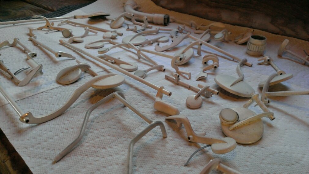 Once the horn is completely clean (you can’t polish through grime, only through tarnish), any particularly rough areas of tarnish will get a spray of 1/4 strength Tarn-X (sulfamic acid aka silver dip) which is quickly rinsed away, or sometimes I’ll do a soak in a very dilute Tarn-X bath- however, sometimes I don’t use it, it depends on the horn. If I use the silver dip, I follow it with a very thorough repeat of the soap and hot water, rinsing until I’d be willing to drink the runoff. Either way, at this point I start using nitrile gloves, and don’t again touch the horn with my bare hands. After washing, dry with an air compressor.