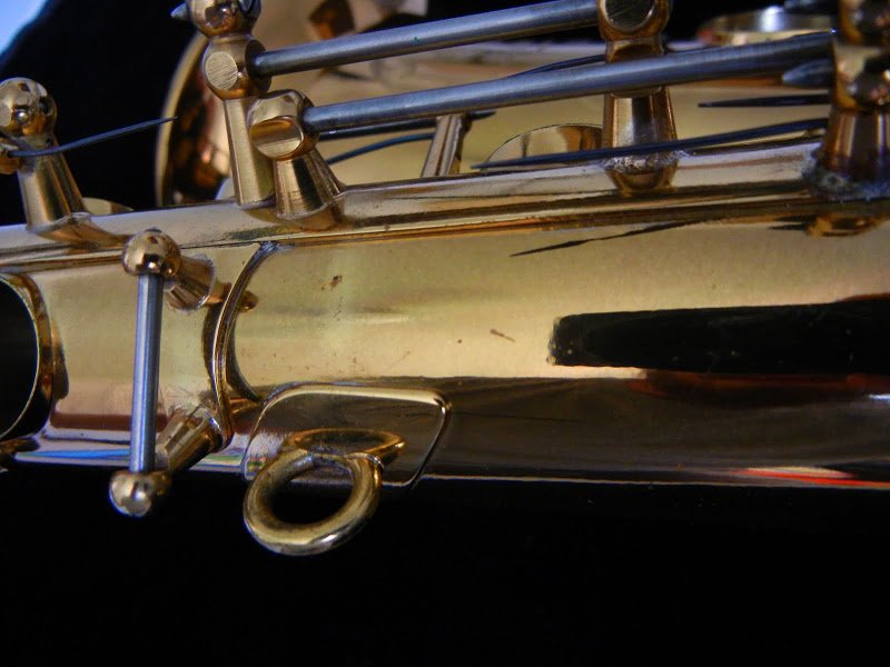 Another example, this one pictorial. This is a Selmer alto, a Mark VI, that was made in 1966. The lighter stripes in the photo below are the shadows from key arms as the last coat of lacquer was applied with the instrument assembled. Why two key arms? See the last picture for the answer!