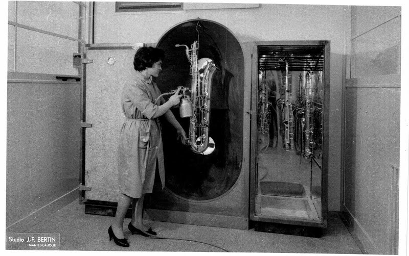 Notice on the right hand side, the lacquer drying oven shows horns both disassembled (first few coats) and fully assembled (last coat).