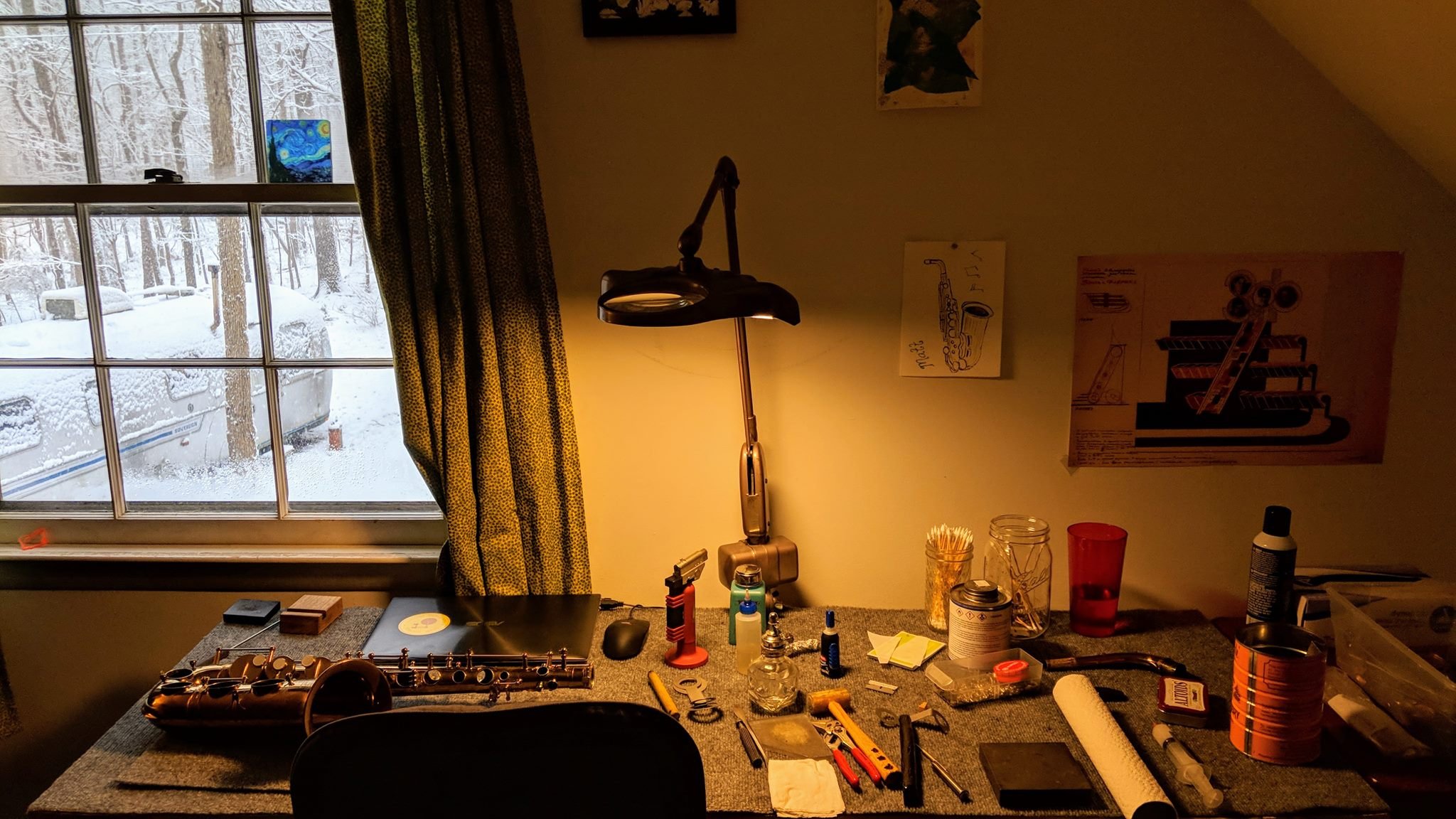 Working from home. Regular workshop (Airstream) visible out the window.