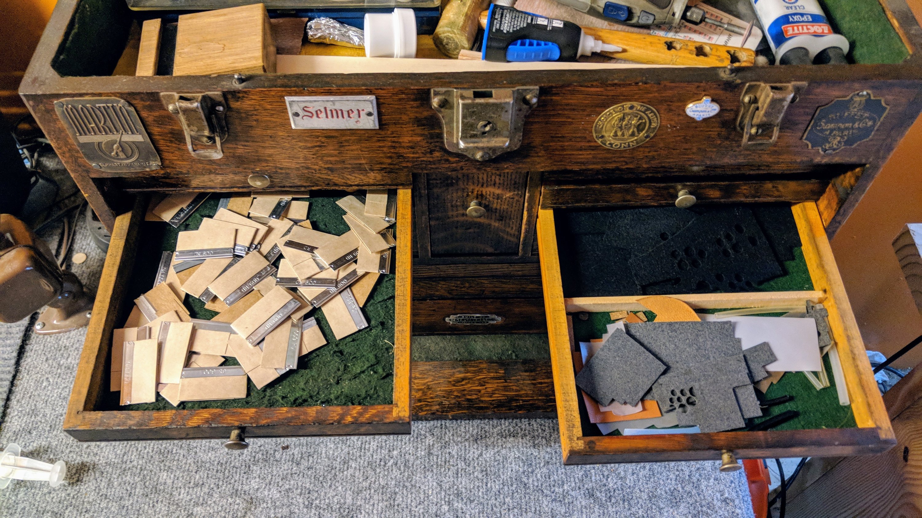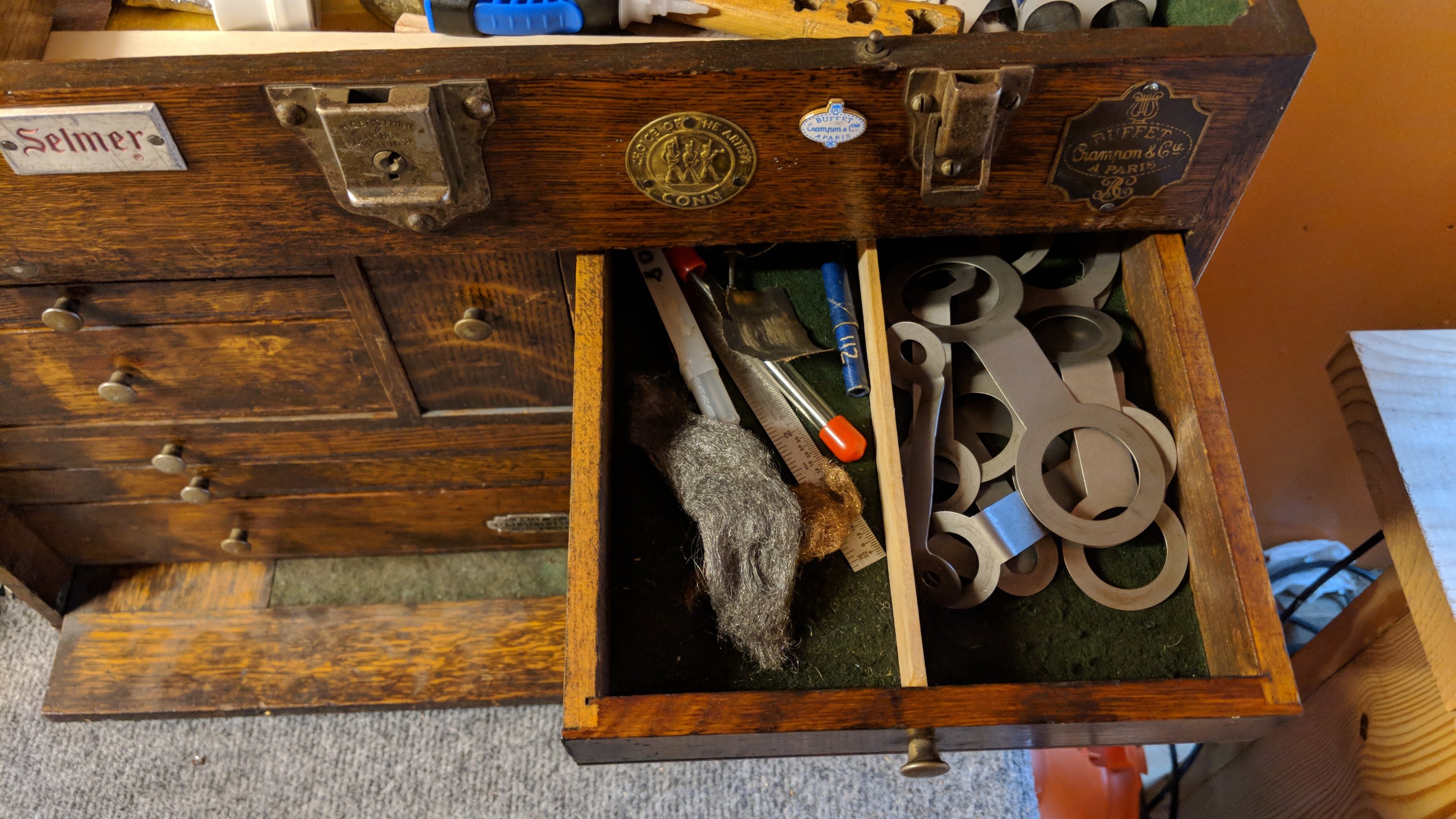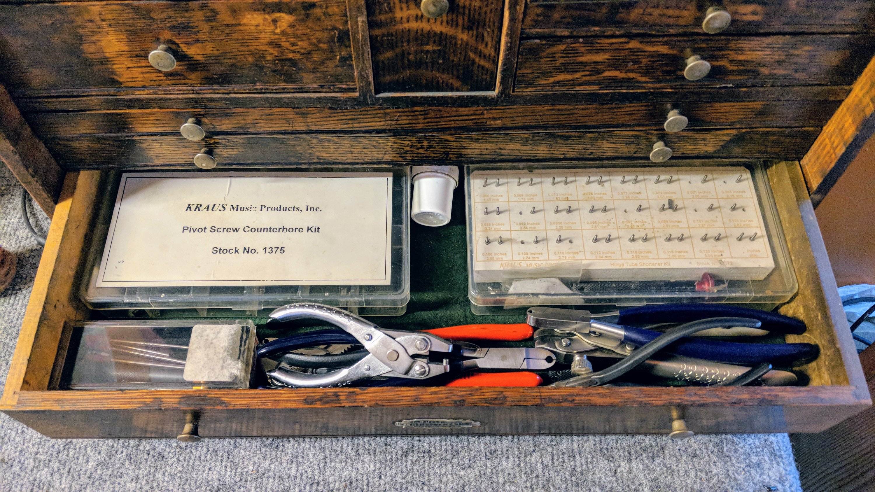 Inside of a little tin that sits in the top of the box: key felts, spare parts.