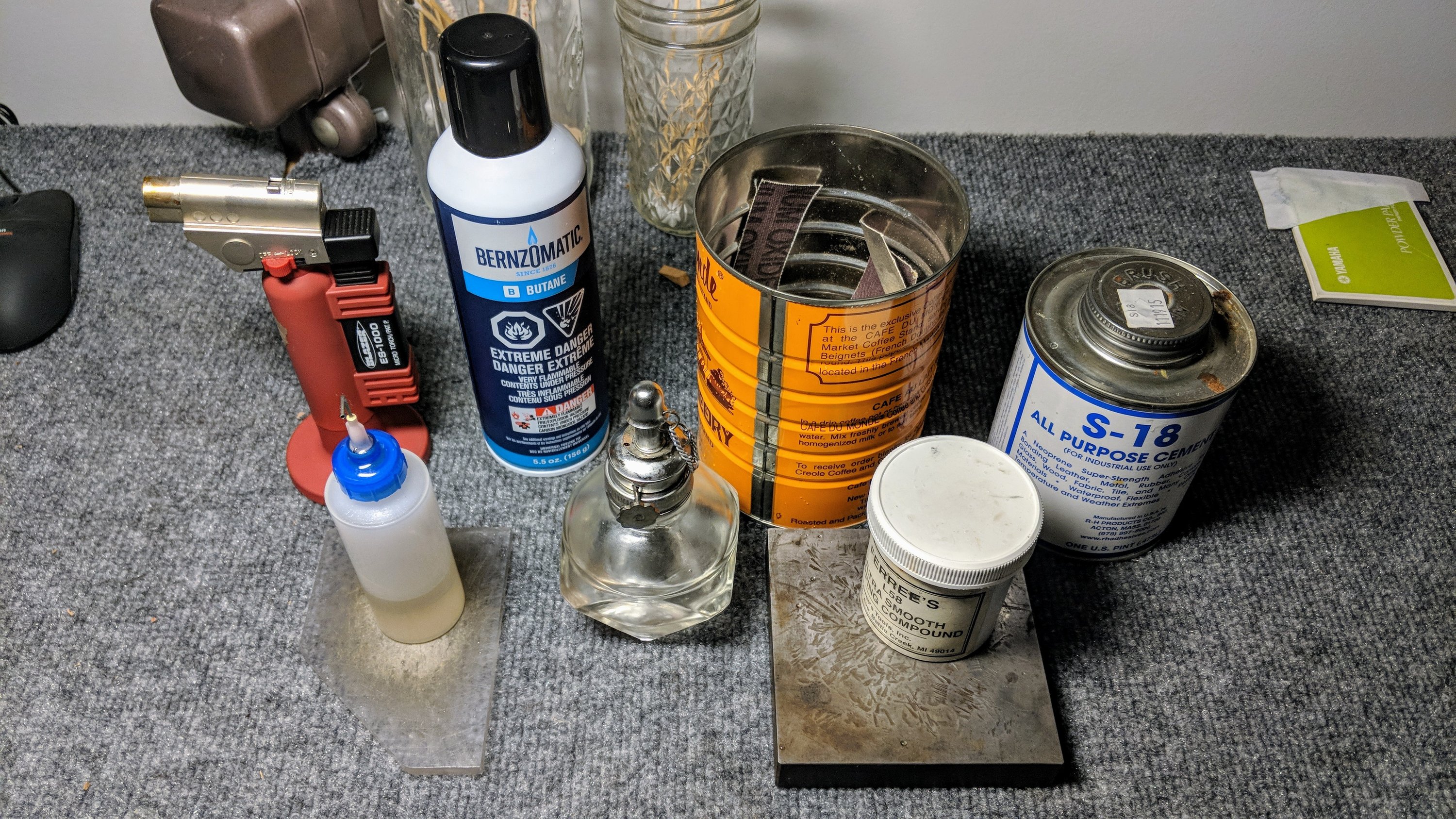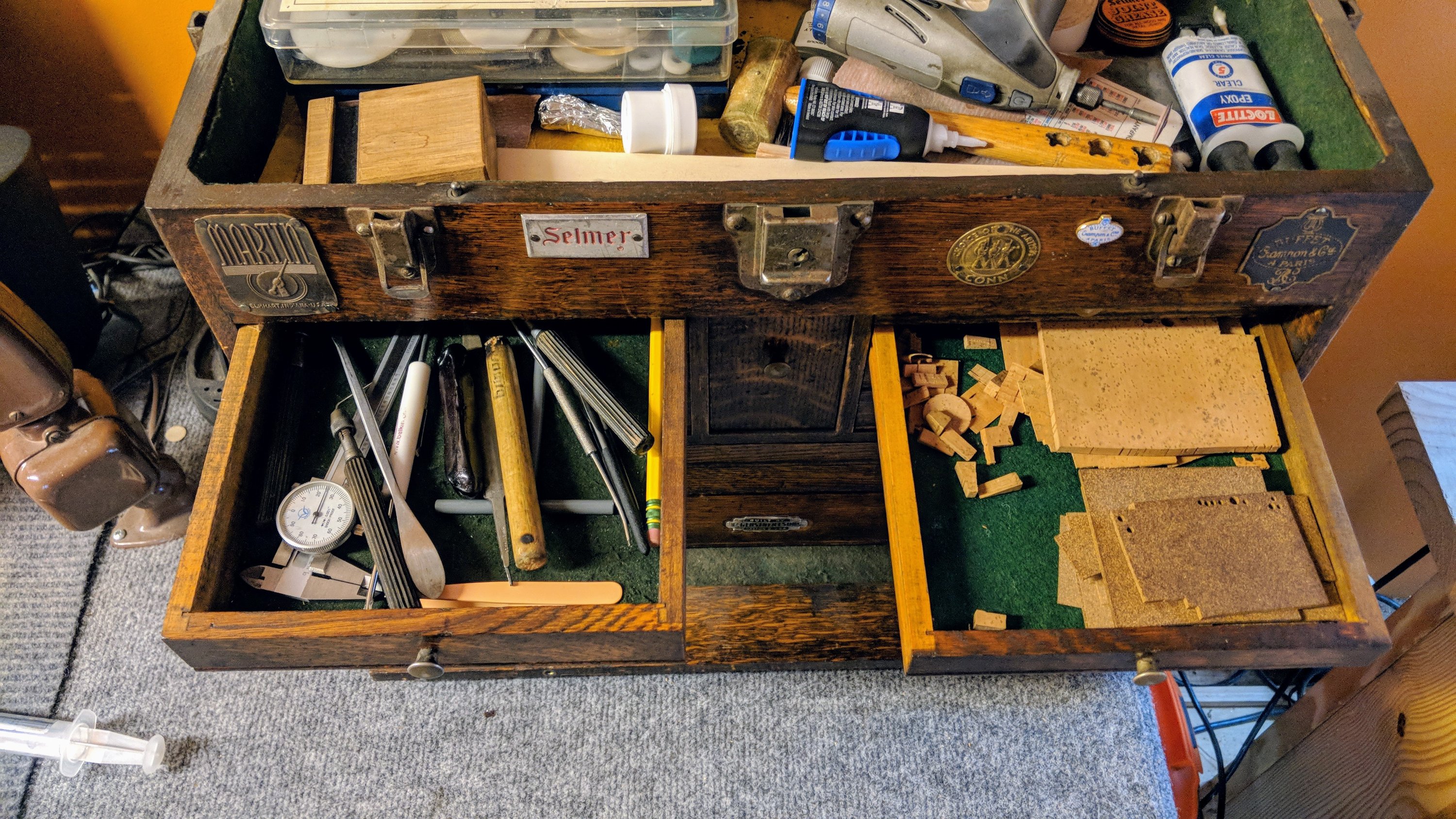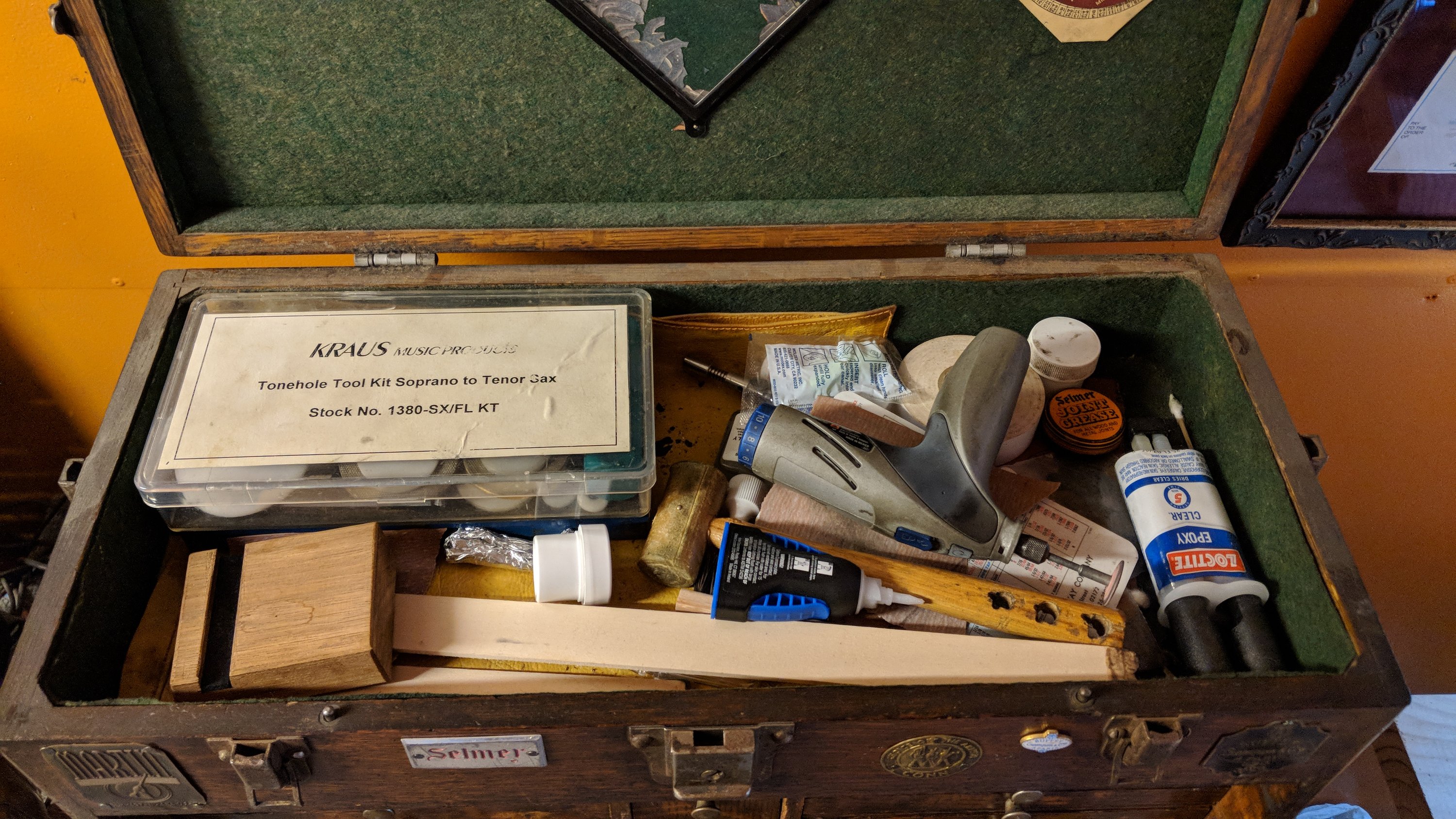Even though I work in a workshop about 50 feet from my front door, sometimes I work from a backup bench in my house- in inclement weather, or perhaps I am feeling lazy. I have an old toolbox where I keep my most-used tools, and over time I have honed it into a fairly complete set of what can get me through 90% or so of my work- once dentwork and cleaning has been taken care of, anyhow. In the event that you find it interesting to know, check through the photos below to see what my personal toolbox contains.