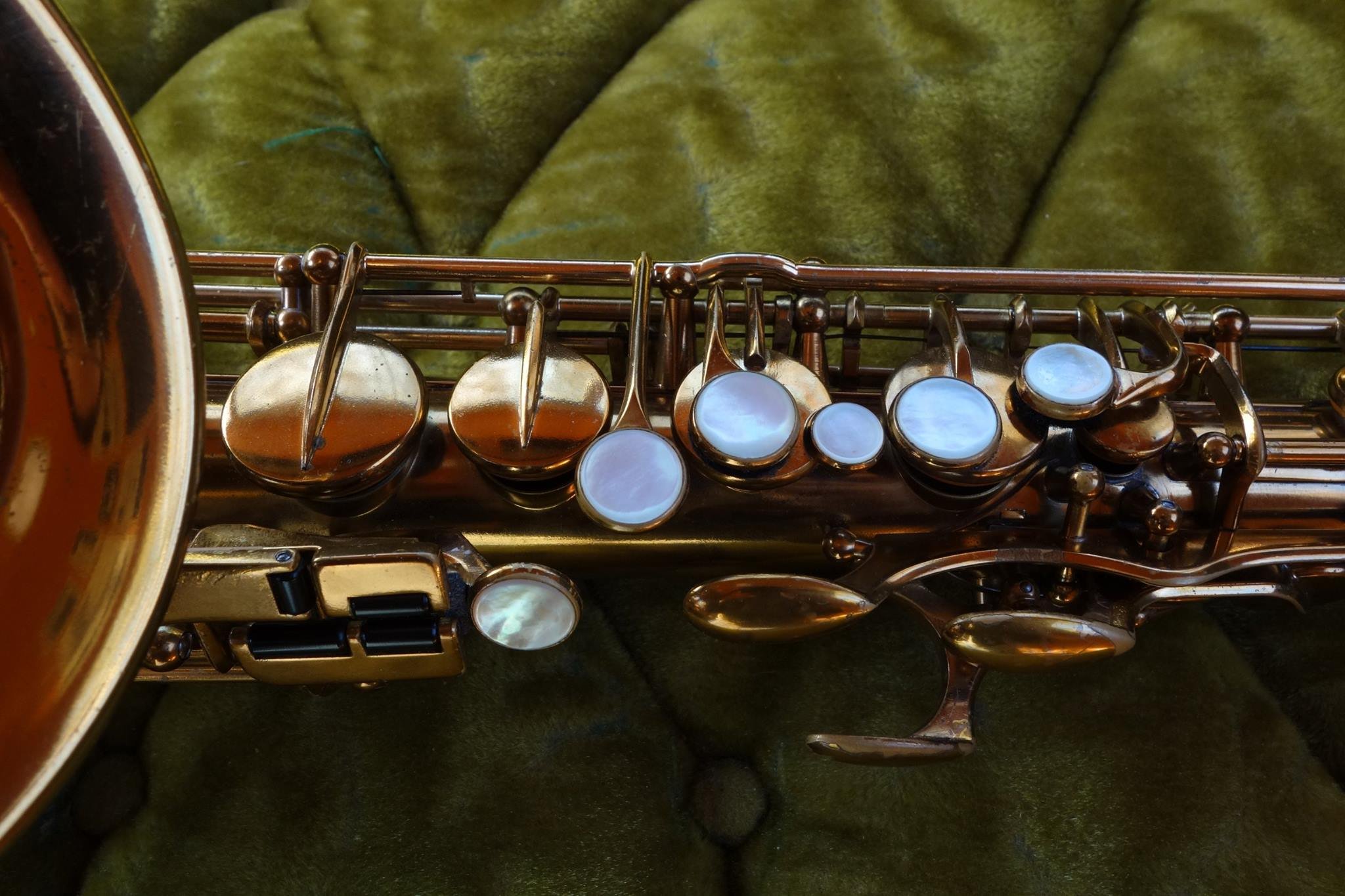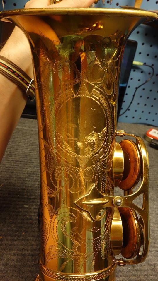 Well here is a horn you don’t see every day. This is a Selmer “Dorsey Model” alto saxophone in what I believe to be a very old factory relacquer- though done extremely well and color-correct so most folks wouldn’t be able to tell, and even a few professionals might be fooled.