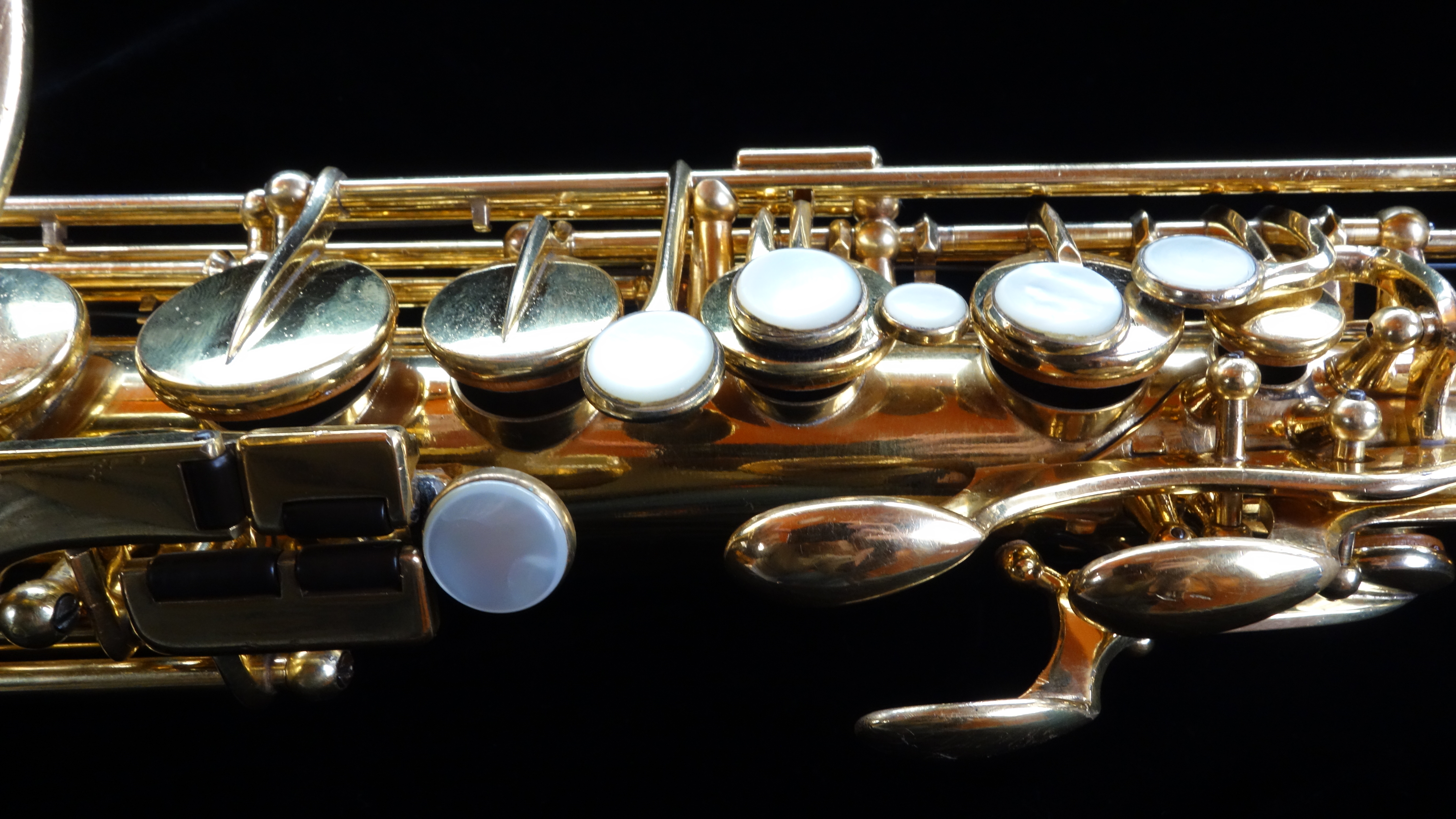 This was a whale of a job- while in good physical condition with its original finish, it was clear that this saxophone had been played a lot and a full mechanical rebuild was in order. Several pearls were replaced, and I remade the G# pearl holder (which has been removed at some point and replaced with a rather crude spatula) and installed a new pearl. Also the key guards had been resoldered at some point in the past, and cleaning that up, straightening them all out, and redoing it as best as I could took a fair bit of time.