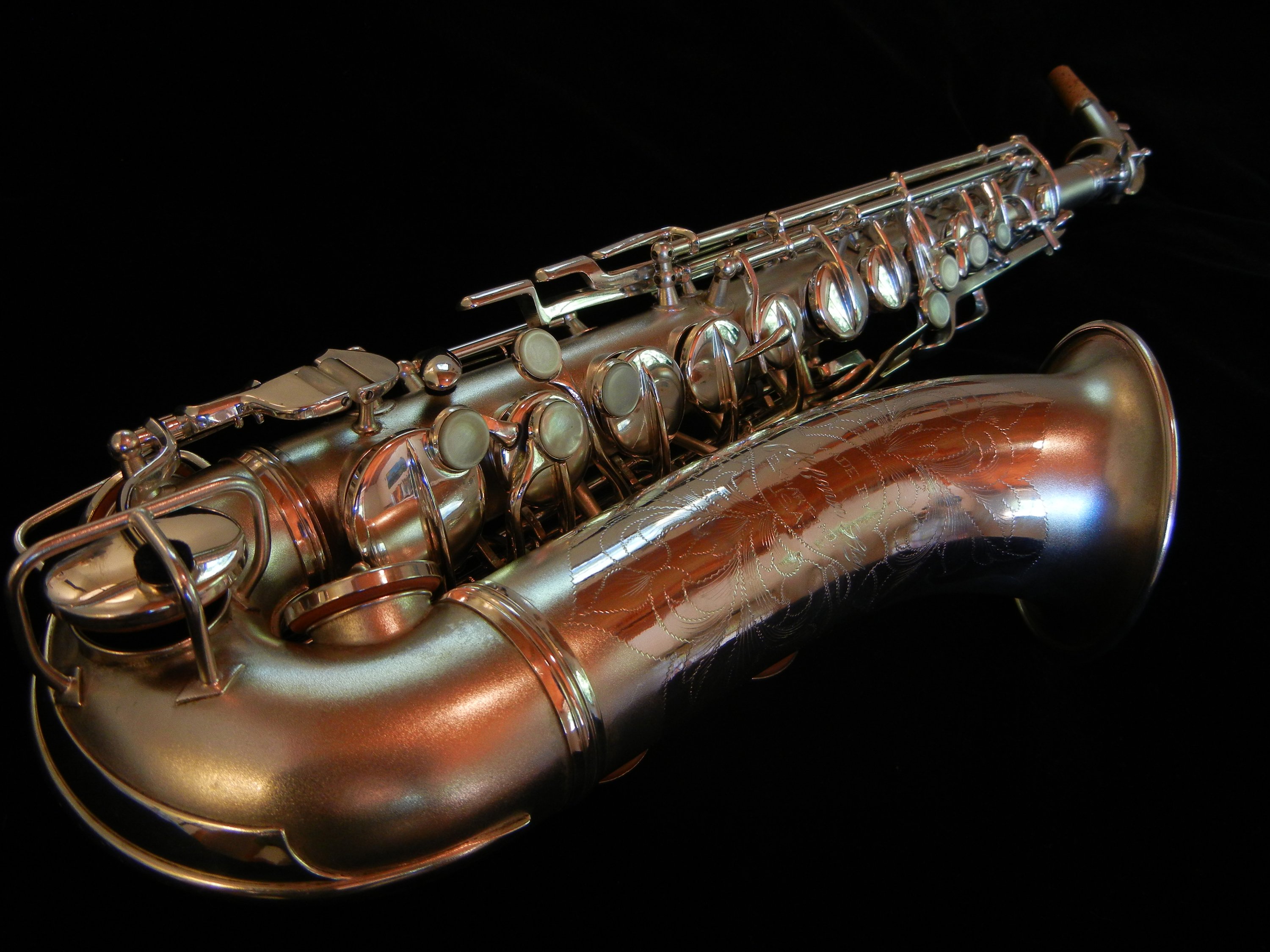 These saxophones in the unusual key of F were introduced months before the market crash of 1928, and only a few were sold- to those rare customers who were both saxophone crazy* and* had disposable income during the Great Depression. The unsold horns- which were the majority- were used as fodder at the Conn repair school. As a result, not many of these unique instruments survive, and even fewer still in this condition.