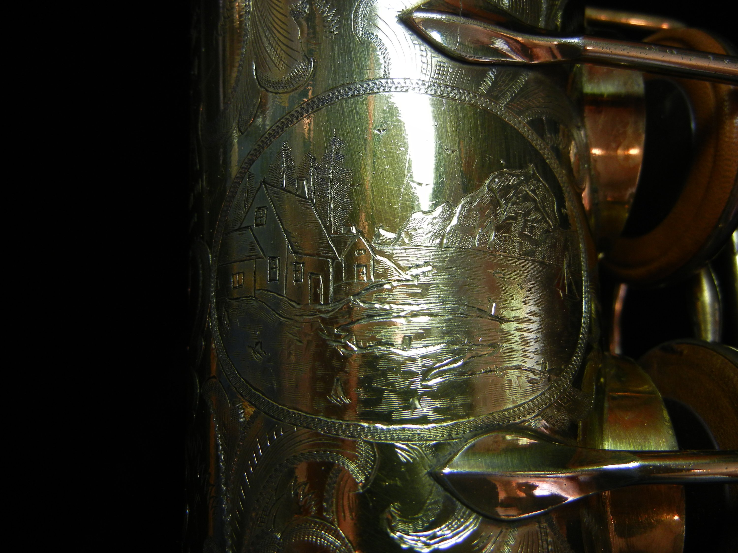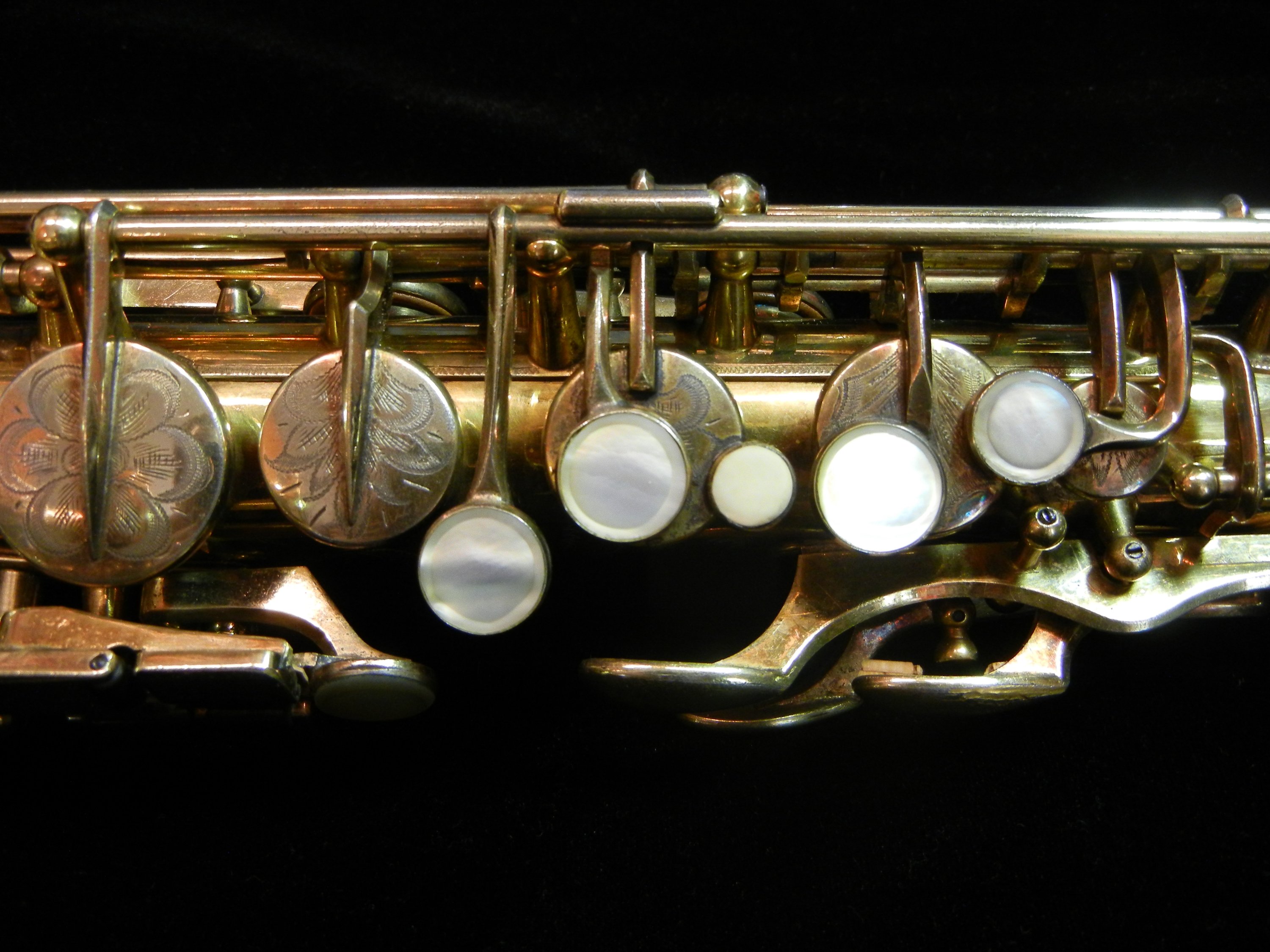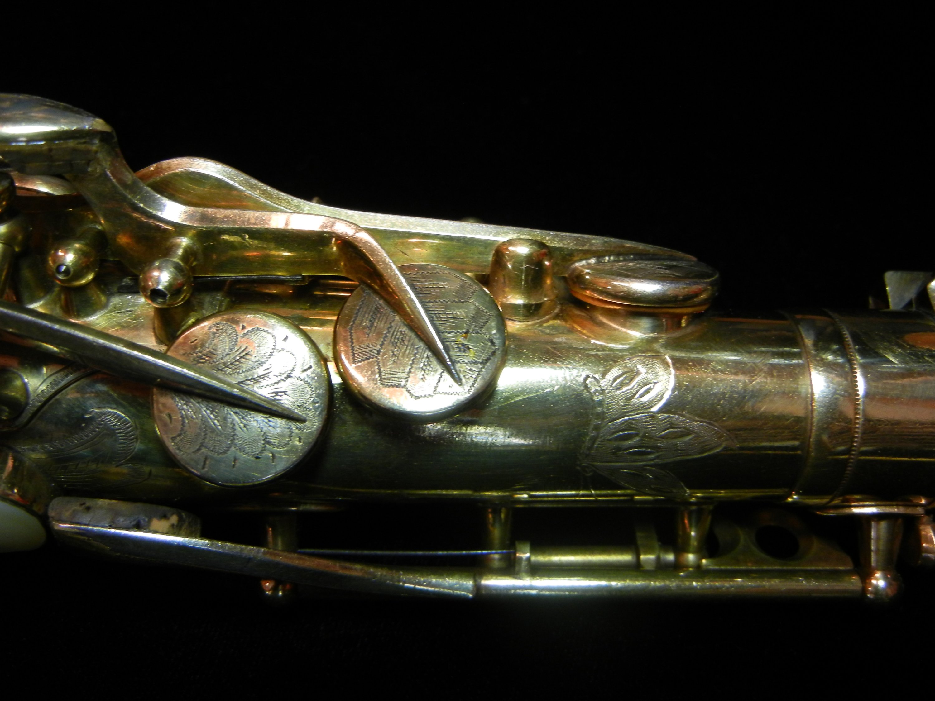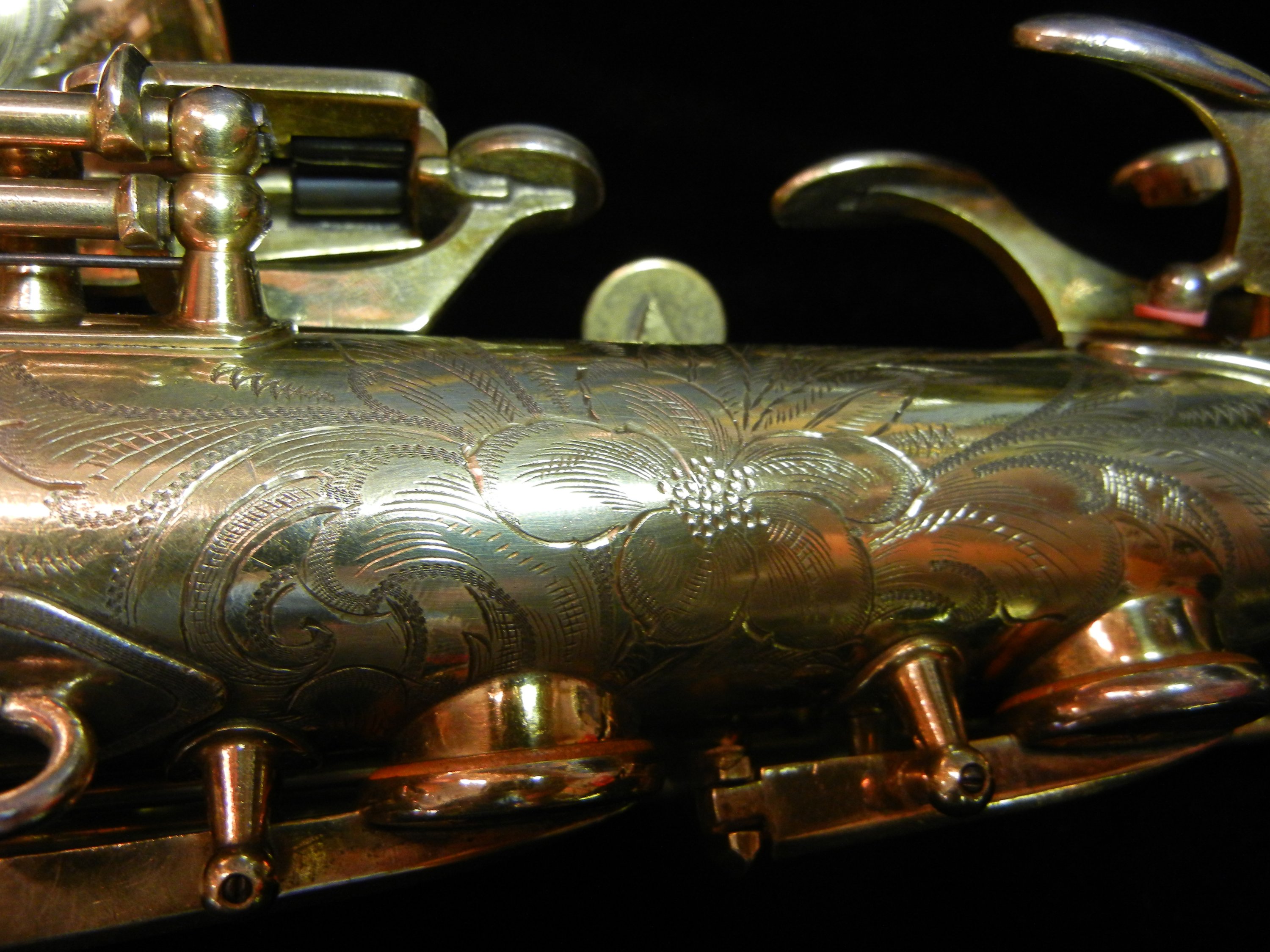 Comparing the engraving to similar motifs found on Conn and King saxophones of the previous decade, it looks as if Selmer Paris’s USA arm in Elkhart (which is vastly different from today’s Conn-Selmer USA) brought in an engraver from Conn to turn this saxophone into the beautiful work of art it is now, and the horn was disassembled in order to do the work. The nude portrait as well as the patterns on the keys (see Conn key engraving patterns here) are extremely similar to earlier Conn work, most notably the fully engraved “Virtuoso Deluxe” finish option. However, unlike the Conn “Virtuso Deluxe” models with similar full engraving, this saxophone appears to be a one-off, and to my knowledge (and the knowledge of several other saxophone experts) this may be the only one of its kind. In fact, even Selmer Paris is aware of this saxophone, and has asked the owner if they can acquire it for their museum in Paris! However, this saxophone is not for sale.