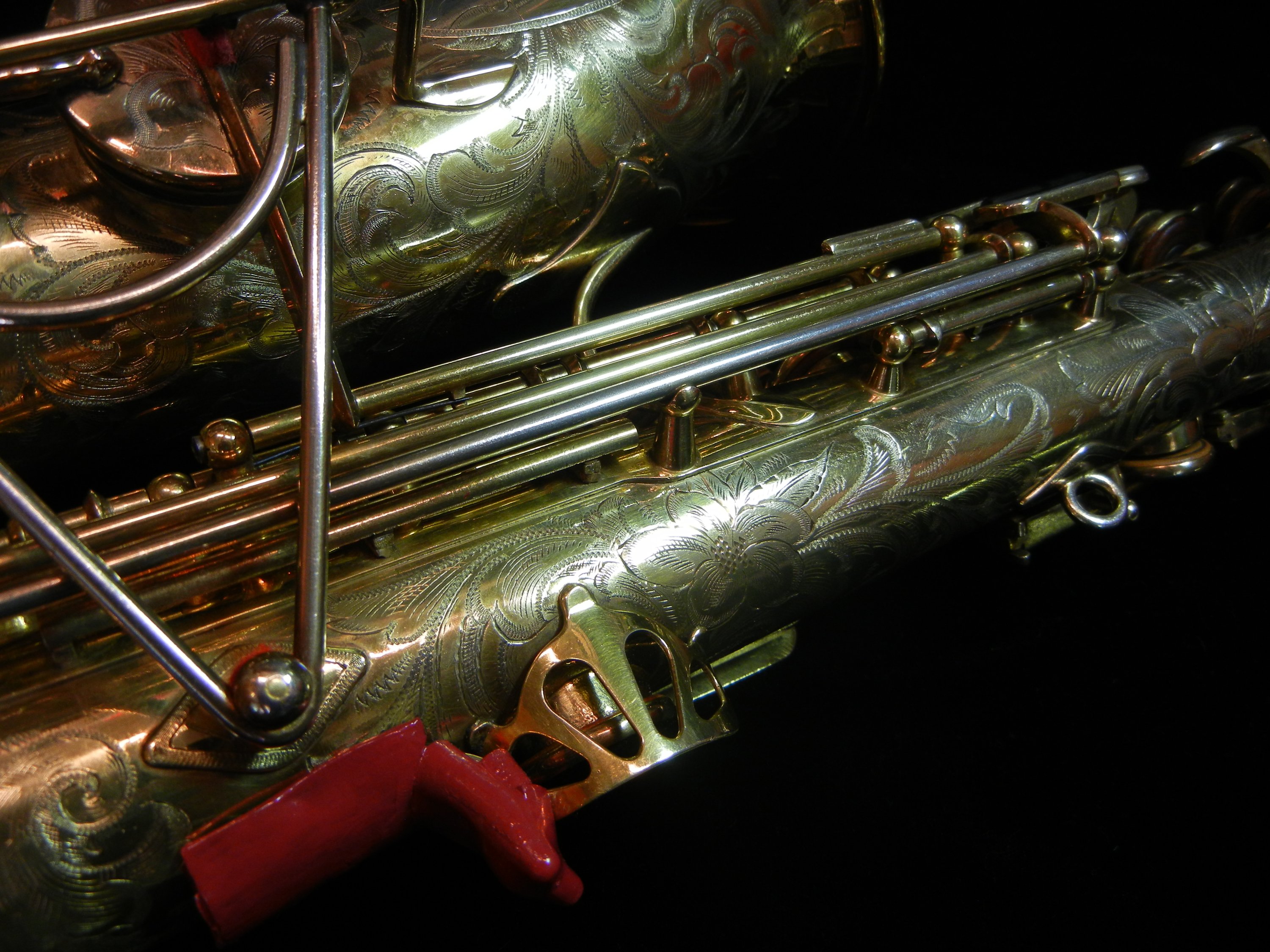 I am lucky enough to work with and see many beautiful and rare saxophones, and these days it takes something rather special to make my jaw truly drop. This past week, completely unexpectedly, a saxophone came through my shop which is about as rare and as beautiful as any saxophone out there, and I am extremely happy to share it with you: a one-of-a-kind 1932 Selmer Super Sax of the “Cigar Cutter” variety, fully engraved from the neck cork to the bell rim, including every single pad cup (yes, even the octave pad cups) and the post feet.