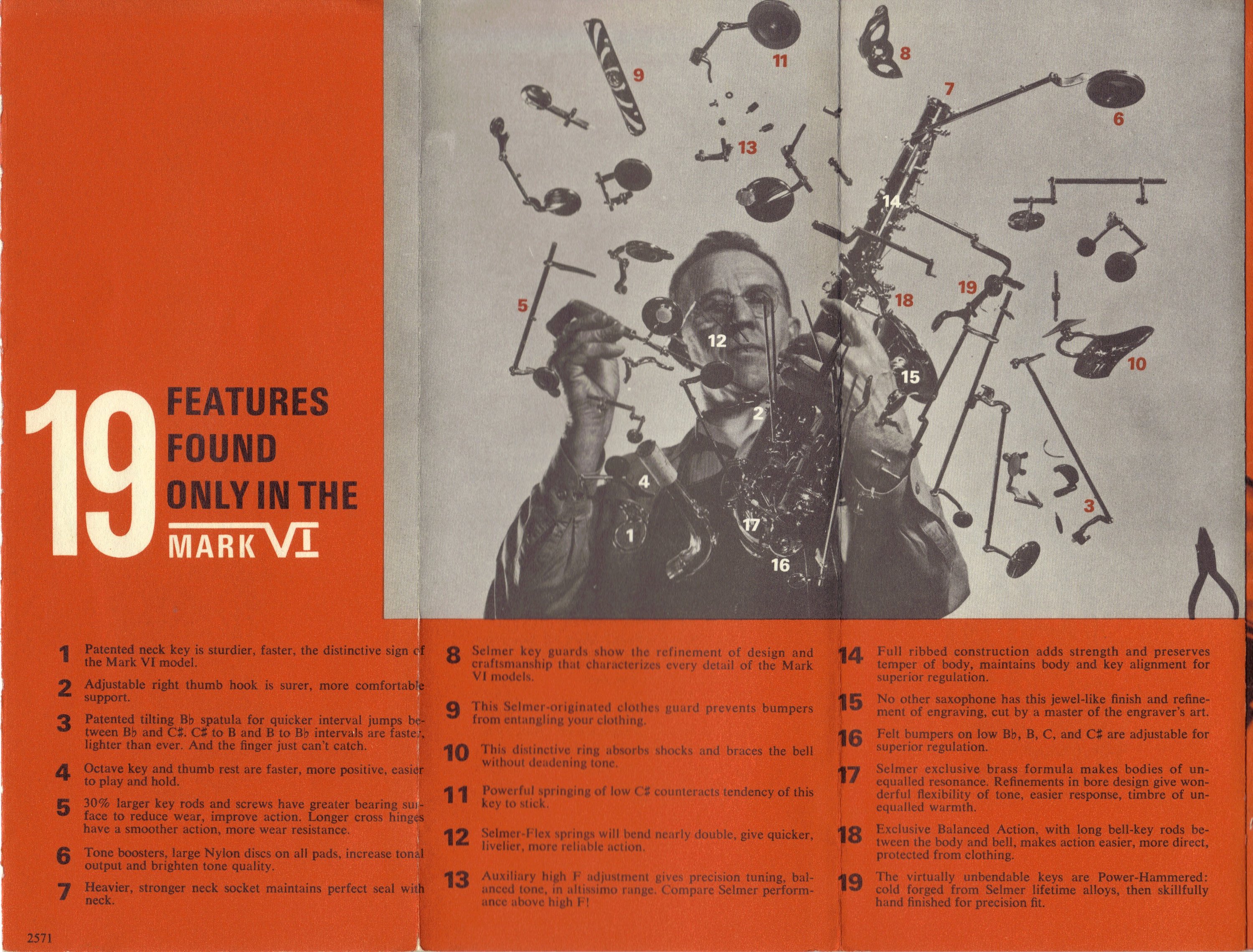 I love original literature, be it ads or booklets or price lists, and I collect them as I come across them. Here are some high-quality scans of the booklets that would have come with your new Selmer Mark VI saxophone. Click on any image for a high resolution version.