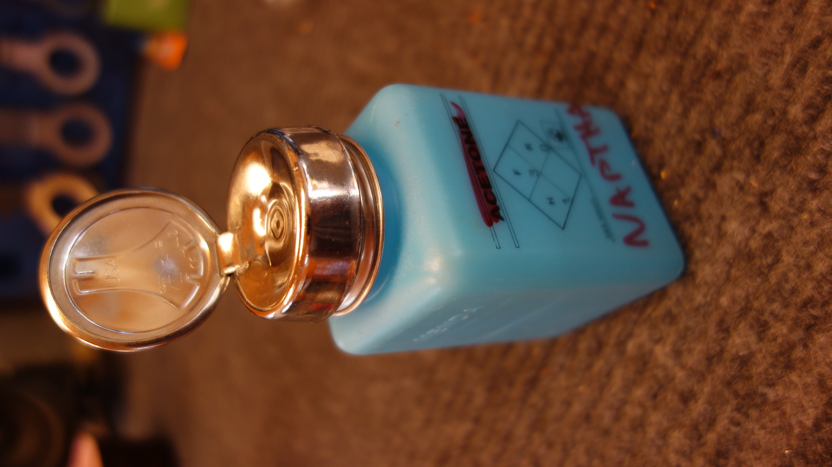 Naptha + dispenser Naptha and a dispenser for application to cotton swabs and pipe cleaners etc. for cleaning. Naptha available at your local hardware store, the dispenser I like best is the “Menda” brand solvent dispensers, available in various places.