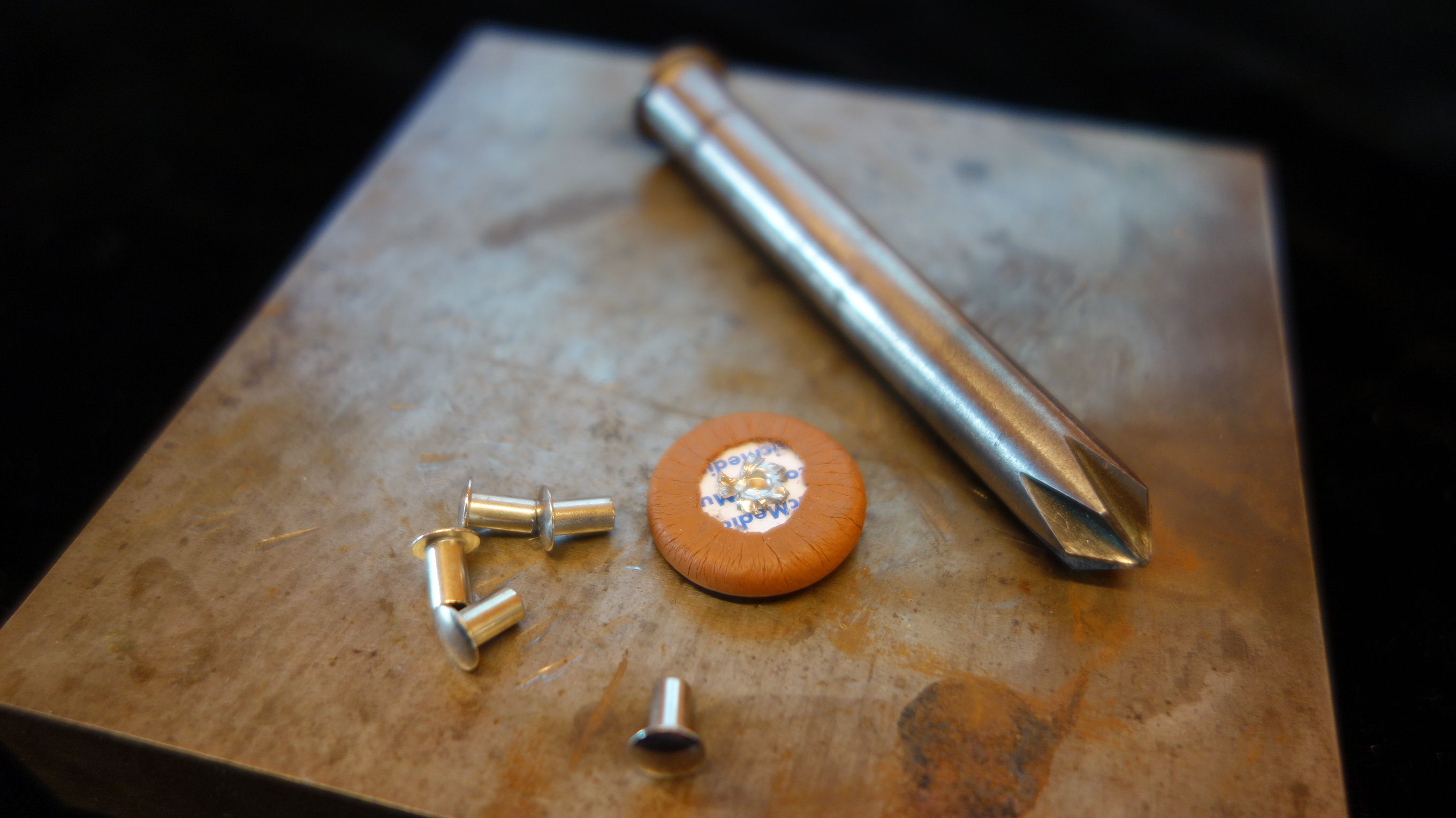 Resonator rivet punch Rivet punch for affixing resonators to pads. Suppliers include Kraus Music, J. L. Smith, Ferree’s Tools, Allied Supply.