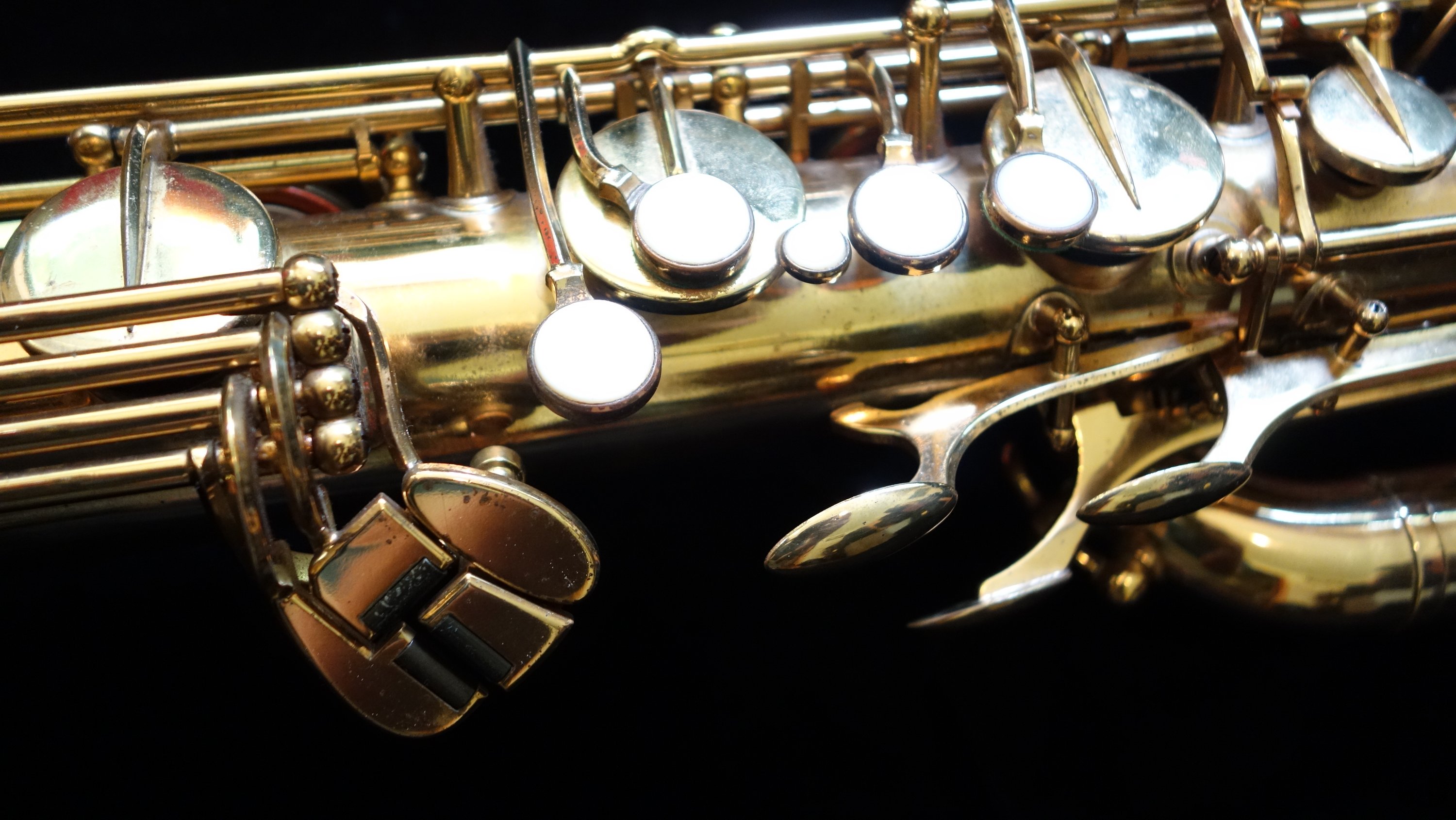 This saxophone has one flaw- a small dent on the top turn. It is in a difficult-to-access location for dentwork, so as of yet I have not attempted a fix. The top turn may need to be unsoldered to get the dent completely removed, but it could be improved and possibly (depending on how lucky I am that day) come all the way out without needing to be unsoldered. If you would like to purchase this horn, you can direct me to leave it as-is or try to remove it- either with or without unsoldering the top turn to get to it. Your call, and we can talk about at length during the purchasing process.