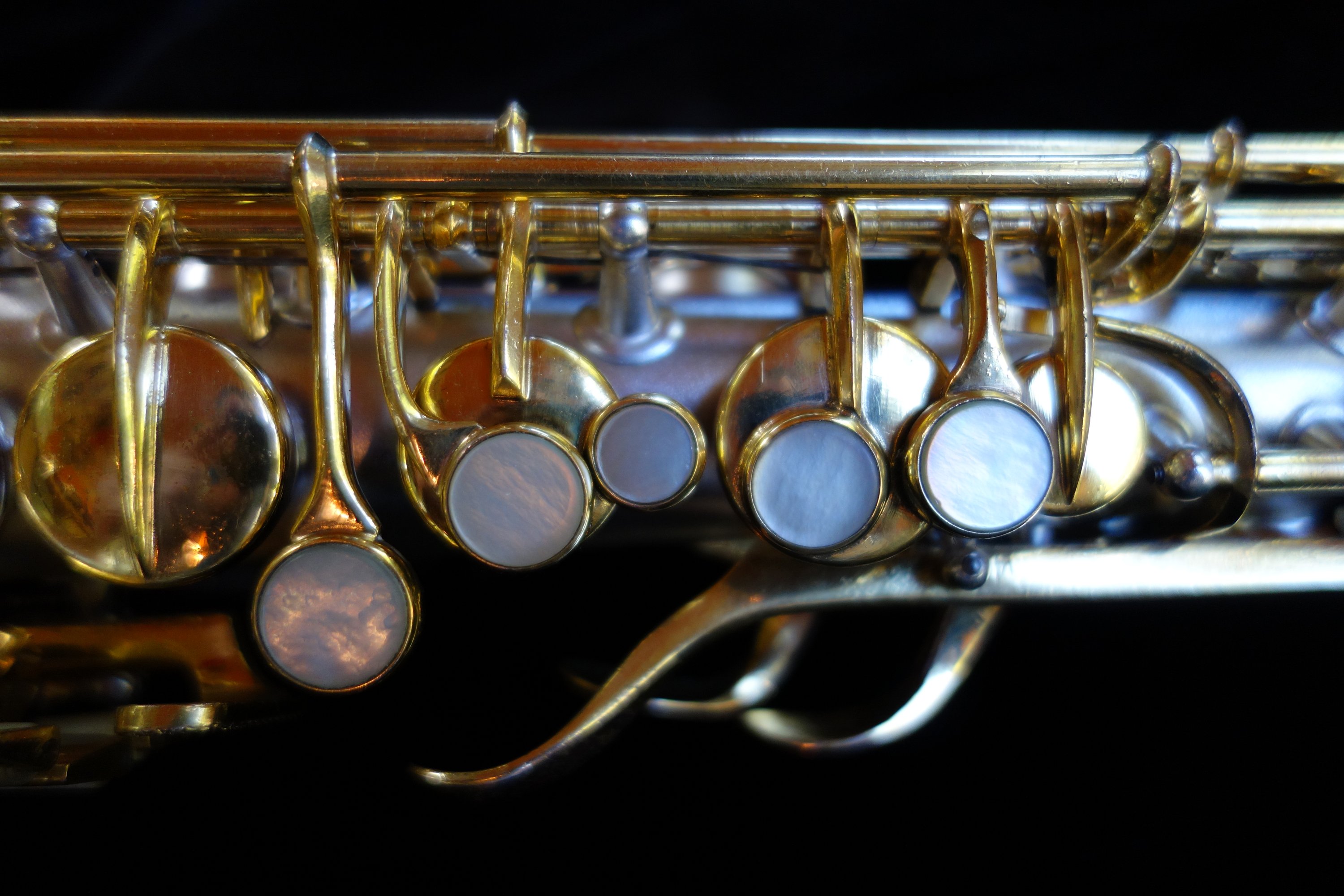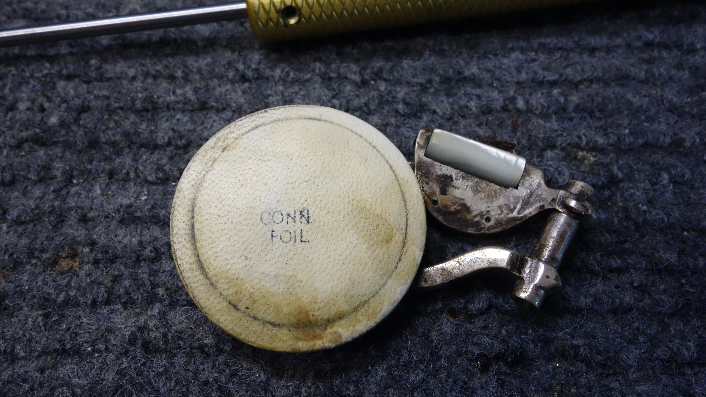 These instruments were bought new together, and the granddaughter of the original owner contacted me a while back to see about valuation and perhaps a sale. I happened to know someone looking for horns like this, so long story short I put them together and a deal was done, whereupon both horns sat at my place awaiting restoration. I have just completed said restorations, and have been rewarded with two truly excellent saxophones. Both of them are physically very clean (though it took some doing) and survive in their original cases. The alto keywork was quite worn, and since New Wonder II keywork is already a challenge to get mechanically perfect, it was a rather large job. The soprano was less worn (though it seemed to have gathered a few dents in its lifetime, now removed), and in fact sported its original lead-foil backed pads! I have included a photo of one of these below for reference- though beware, most don’t have the “Conn Foil” stamp on them. You have to be careful with disassembly and disposal of those old white Conn pads with the center stitch- that powder falling out from behind the dry-rotted leather is actually lead dust.