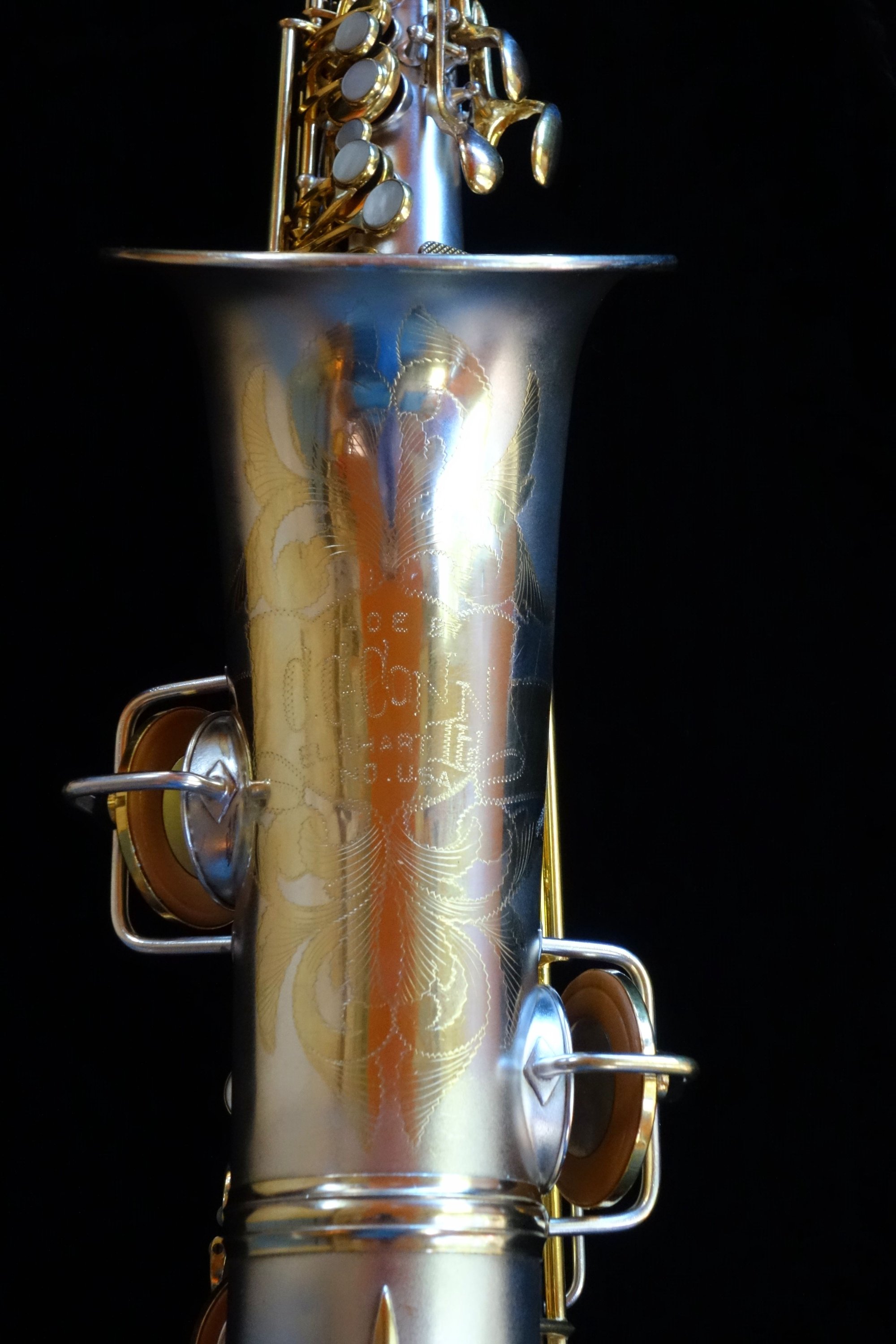 The alto is a premium finish of the time, gold plated keys and engraving with a silver plated body. Typically the gold on horns with this finish seem to be very worn out or even worse evenly thinned out, leaving the gold color unsaturated and weak- perhaps due to repairers in the past throwing the keys in with the body in to a silver cleaning solution, which will strip gold down in short order. These keys however have enough of their gold left to show what these horns originally looked like, and the result is beautiful.