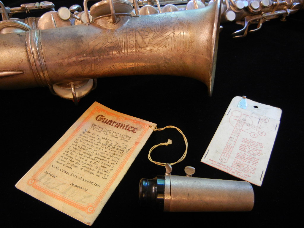 This is a very early Conn 6M transitional alto saxophone with original case, original mouthpiece, original neck strap, original lyre holder, and original warranty booklet. It has never been overhauled, and still sports its original pads from its manufacture in 1931. This is an exceptionally rare find in my experience for a Conn, and before now I have only seen one other horn with its original warranty booklet. That makes this horn a saxophone that will play great, look beautiful once I overhaul it before sale, and be a good collector’s investment.