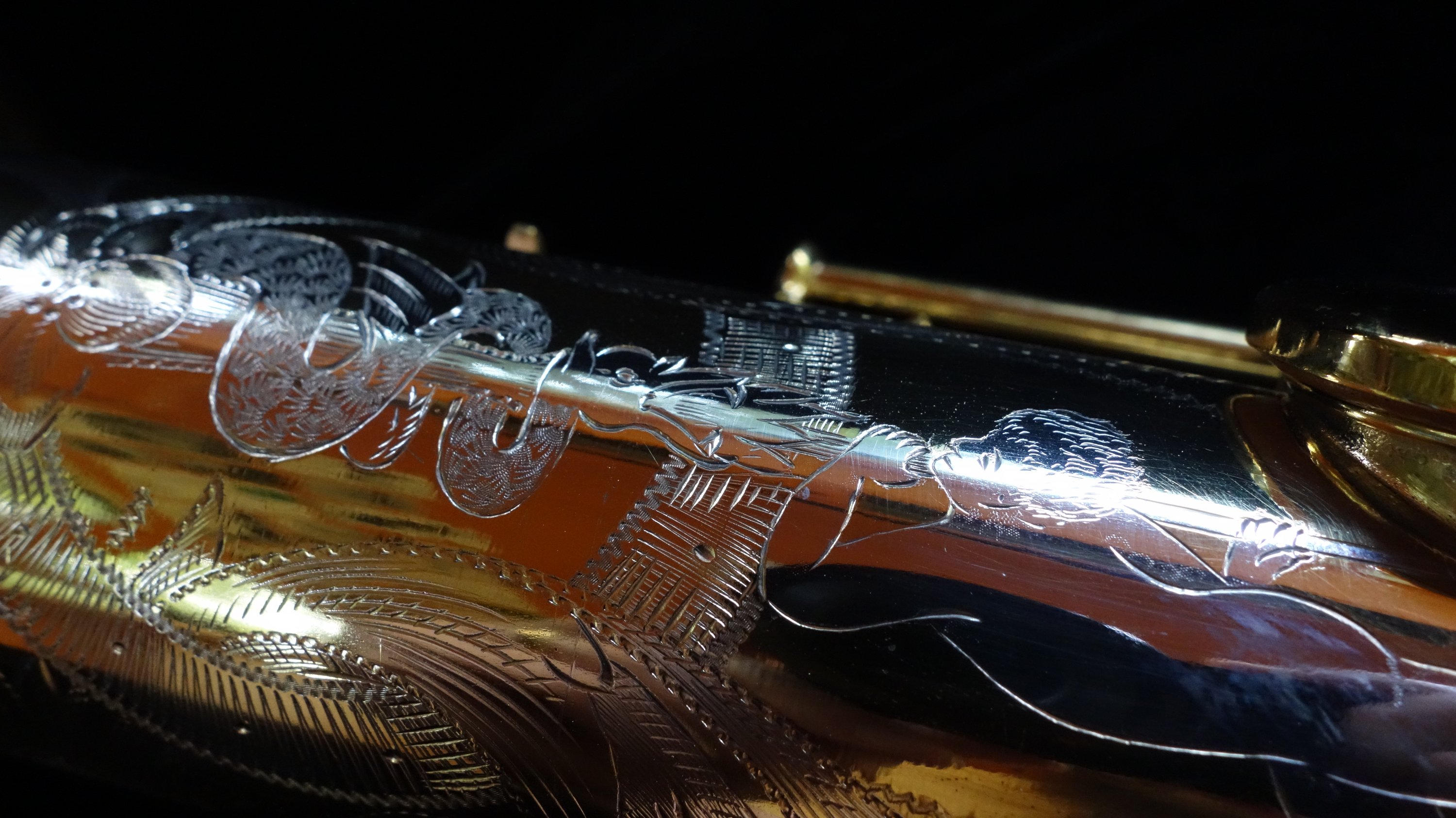 This is a 1926 Conn New Wonder Series II soprano saxophone in the extremely rare finish option known as “Virtuoso Deluxe”. Heavily gold plated and hand burnished, hand-crafted pearl inlay on every key, and elaborate engraving that typically covers the entire horn. On this particular example, there is a dragon-slaying scene (apparently used more than once on Virtuoso Deluxe sopranos of the same era, see here and here) where the dragon and the dragon-slayer are highlighted in silver.