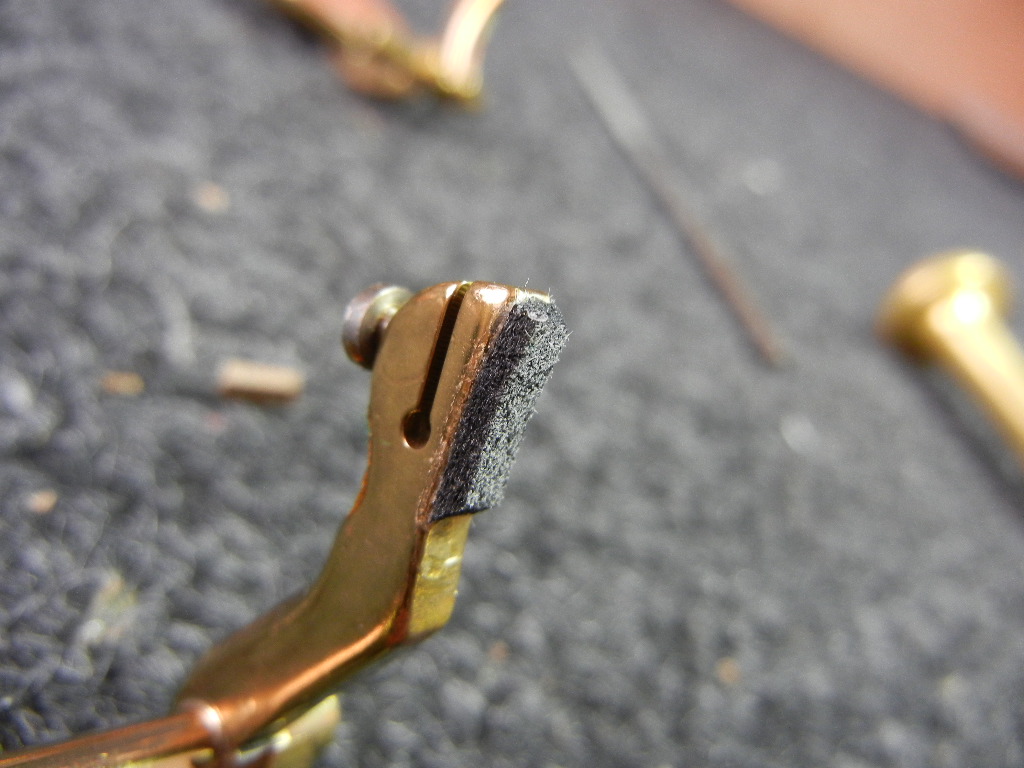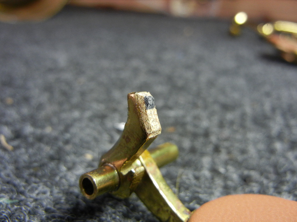 Adjustment materials have two main jobs: the* transmission* of force and the absorption of force. An example of transmission of force is the stack adjustments that make the upper and lower stack keys operate in sync with the C# and F# keys (sometimes called the bar keys) respectively- depress key X and key Y moves in perfect sync. An example of absorption of force is the material on the key feet of a stack key- they control the height of the key when open with their thickness and they stop and silence the key when the player releases pressure on the key and the key foot springs back and rests against the body. Many materials transmit and absorb, in differing ratios depending on the particular situation- for example the tiny pieces of adjustment material on the octave bar rocker of a Mark VI that must keep the octave mechanism tight yet silent, or the materials you use on the side keys when they are actuated by a separate arm like on a Conn 10M. Even stack key adjustments, while the main job is transmission, must absorb just enough energy so they are quiet- after all, noise is energy, and if we want silence, that energy must be absorbed or even better kept from transmitting in the first place.