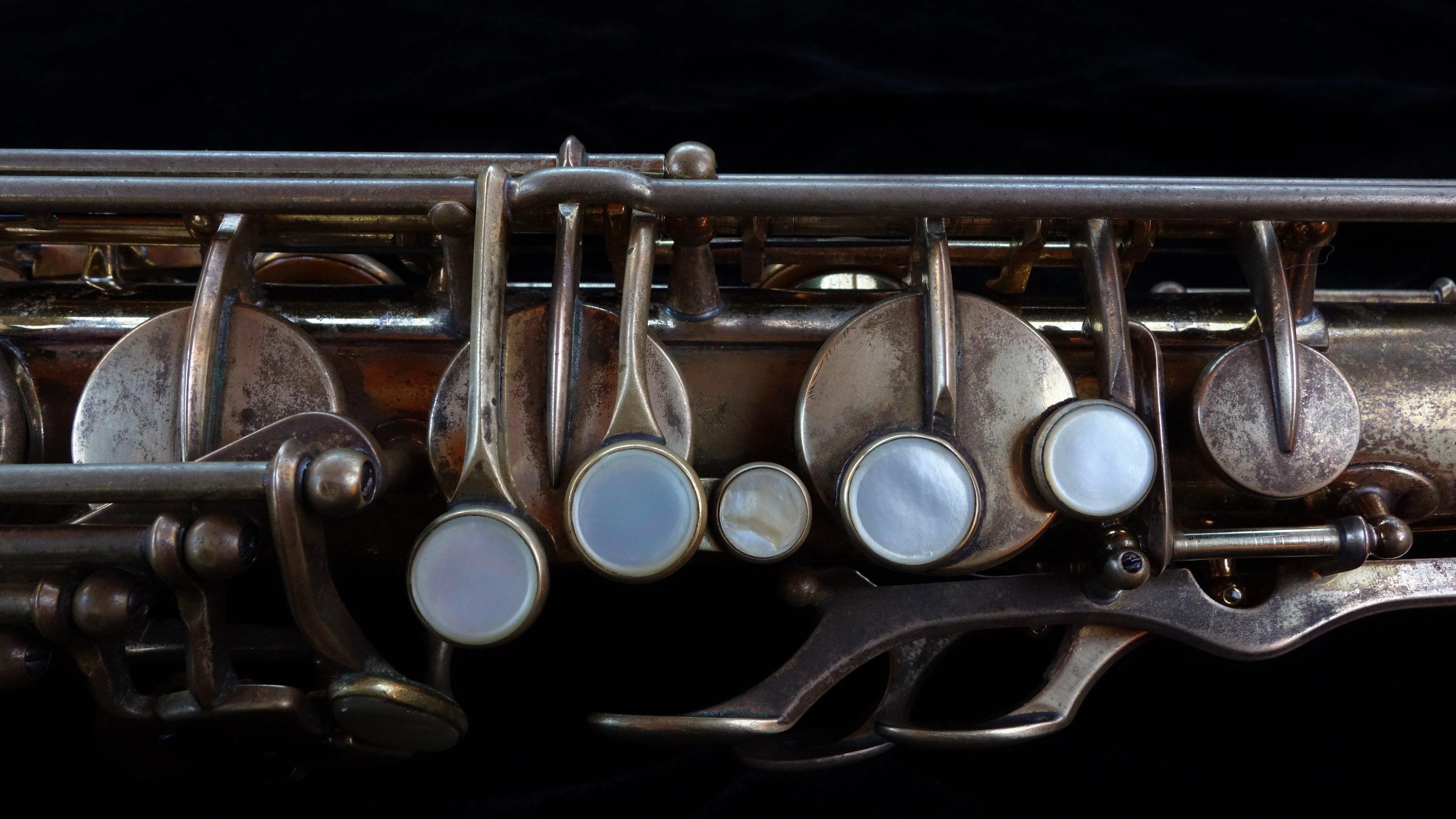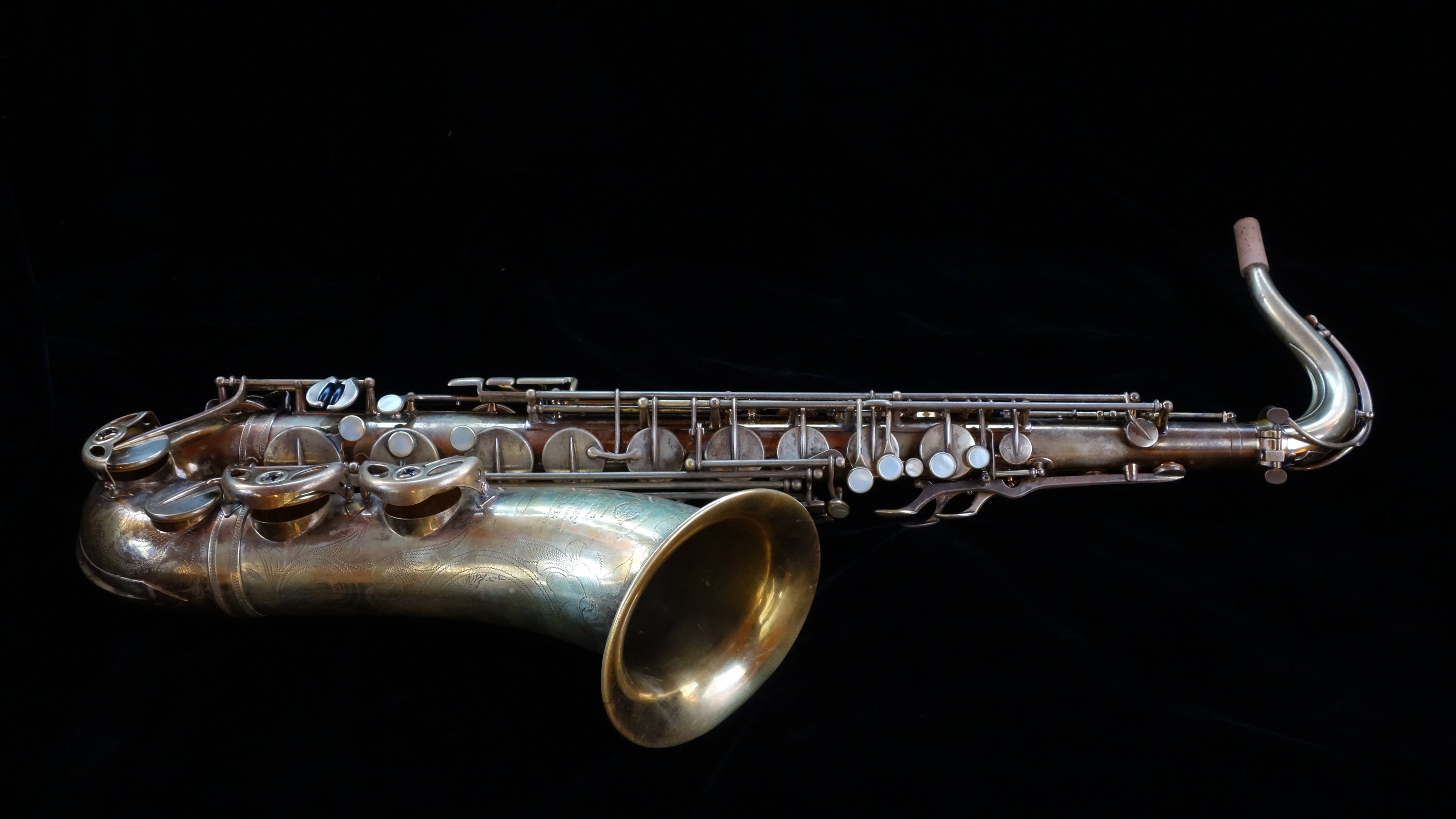This is a Selmer Balanced Action tenor saxophone from 1939. This horn had a single owner, a man named Jennings Titus, who bought it new in 1940. Shortly after purchasing, he enlisted in the Army, and he played in military bands all over Europe during World War II. When he flew from place to place, he would send the horn with the officers since there was a lot more room in the officers plane, and he himself would fly with the rest of the enlisted bandsmen. His plane was shot down, but the officer’s plane was unhurt, and he spent the rest of the war in a POW camp while his horn was sent home to his parents. After the war, he reunited with his family and his horn, and played it for the rest of his life. Several years after his death, his daughter brought it to me to fix the old girl up, and I’m happy to say that this ended up being an absolutely beautiful horn that plays every bit as good as it looks. Every once in a while, you come across a Selmer that can give a Conn a run for its money in the big tone department, and this horn happens to be one.