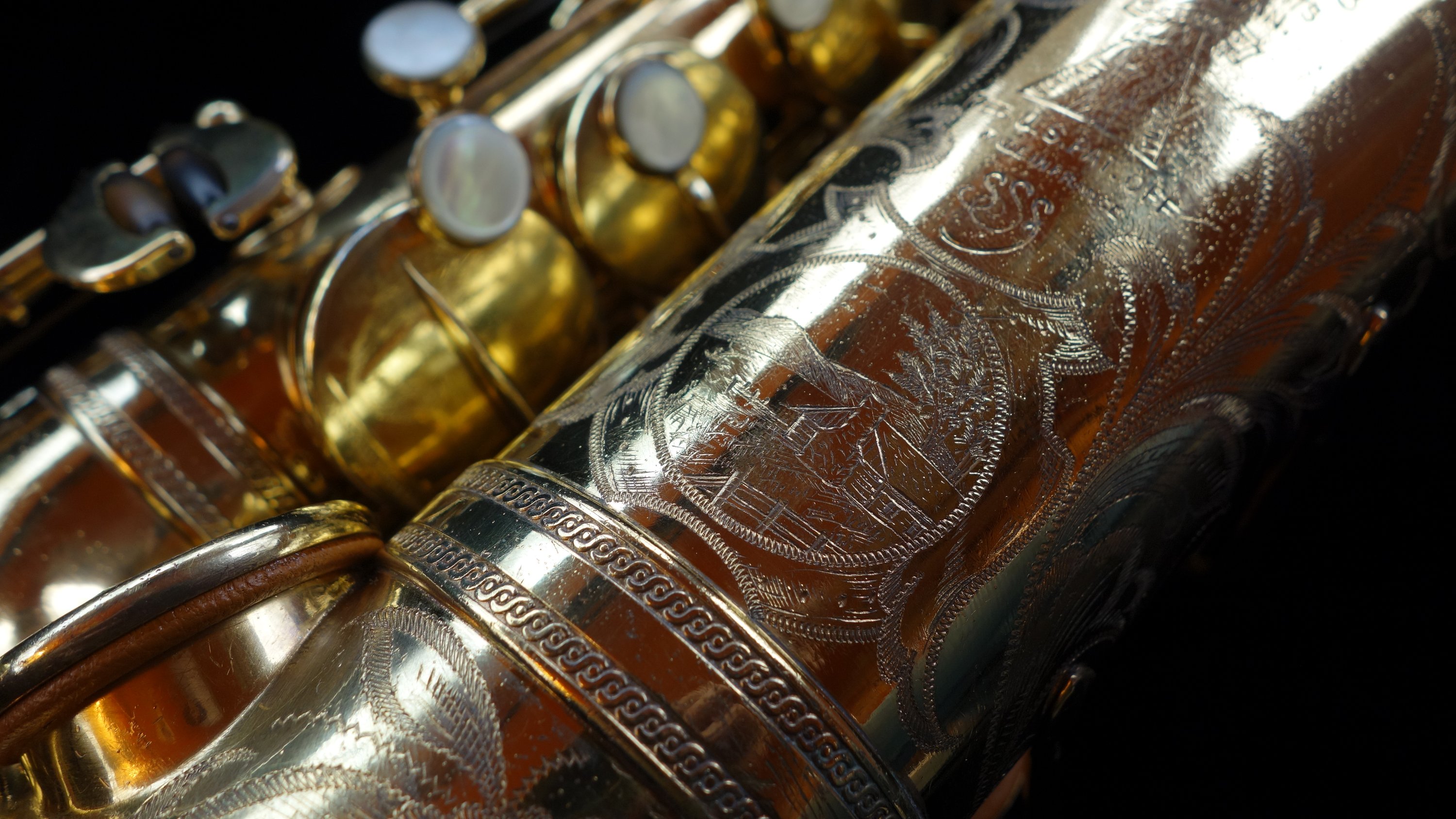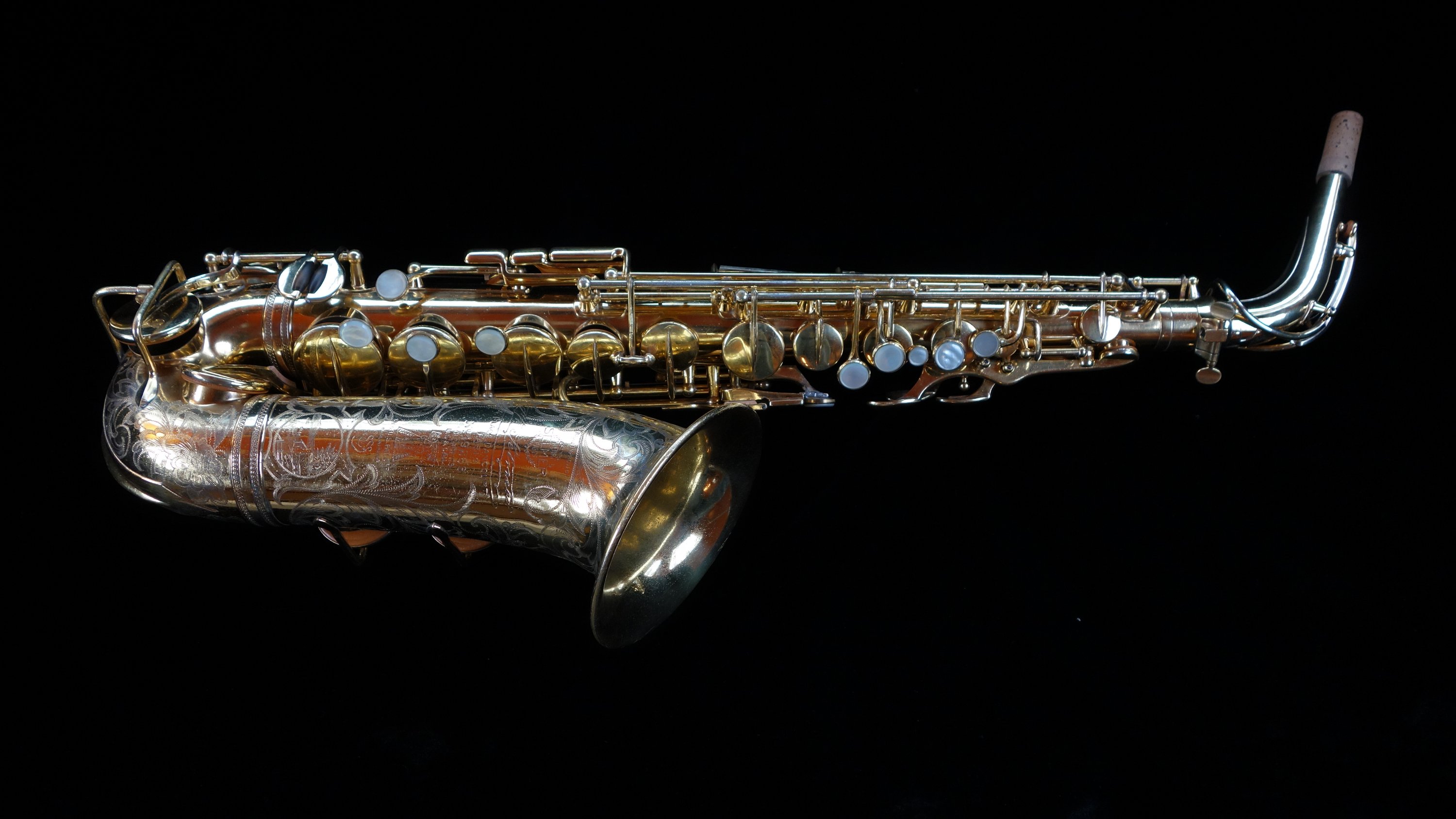 This is a Selmer Radio Improved model alto saxophone in burnished gold plate with the American style engraving. This is one of probably between two and five saxophones of this model ever made with this finish and engraving pattern, and likely the only saxophone with this exact engraving scene as they were typically a little different from one to the next.