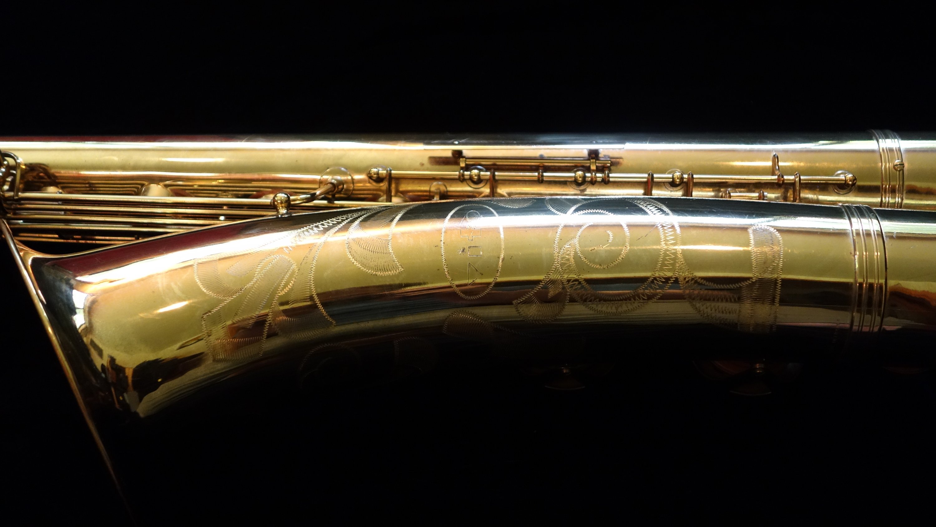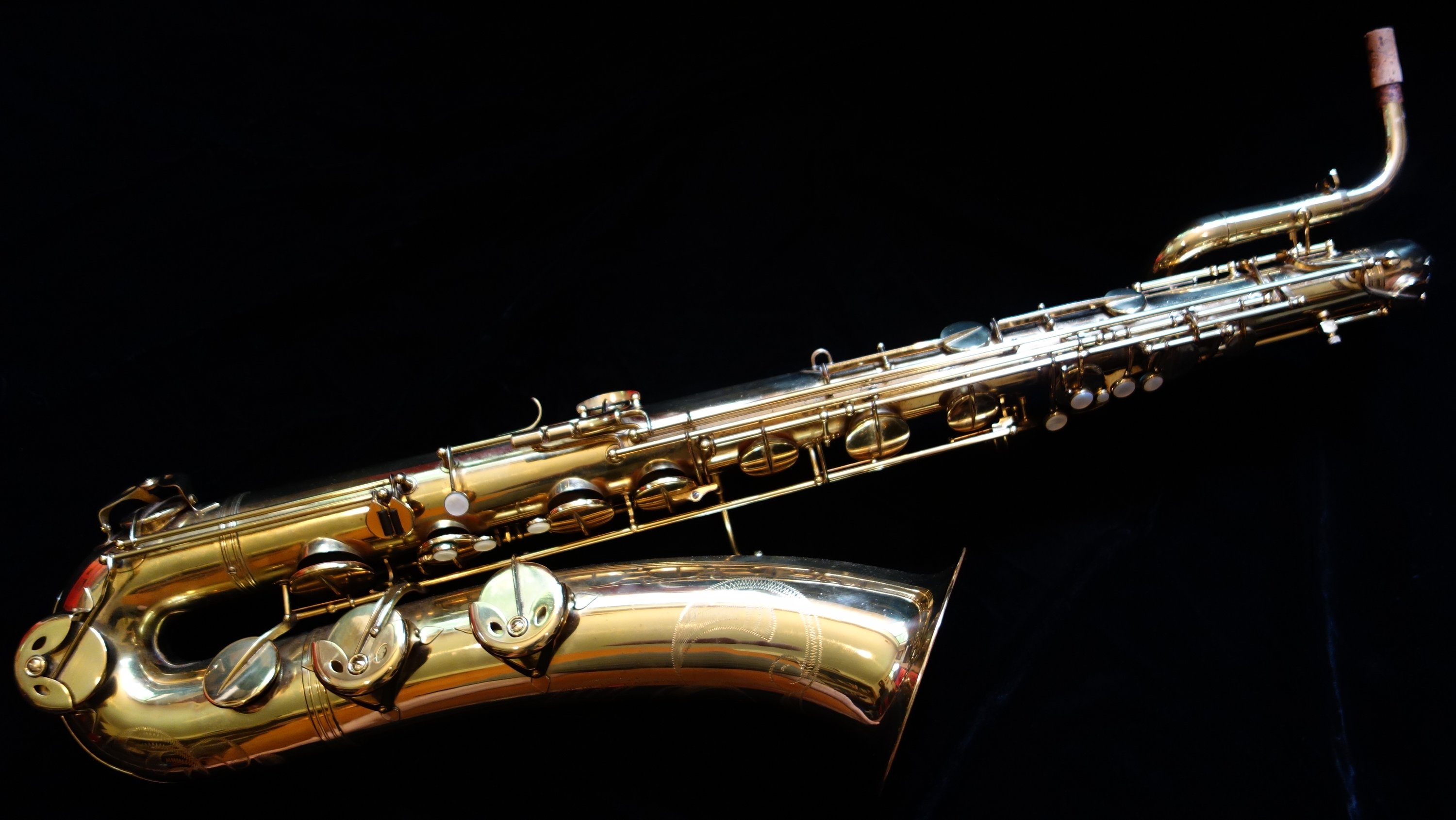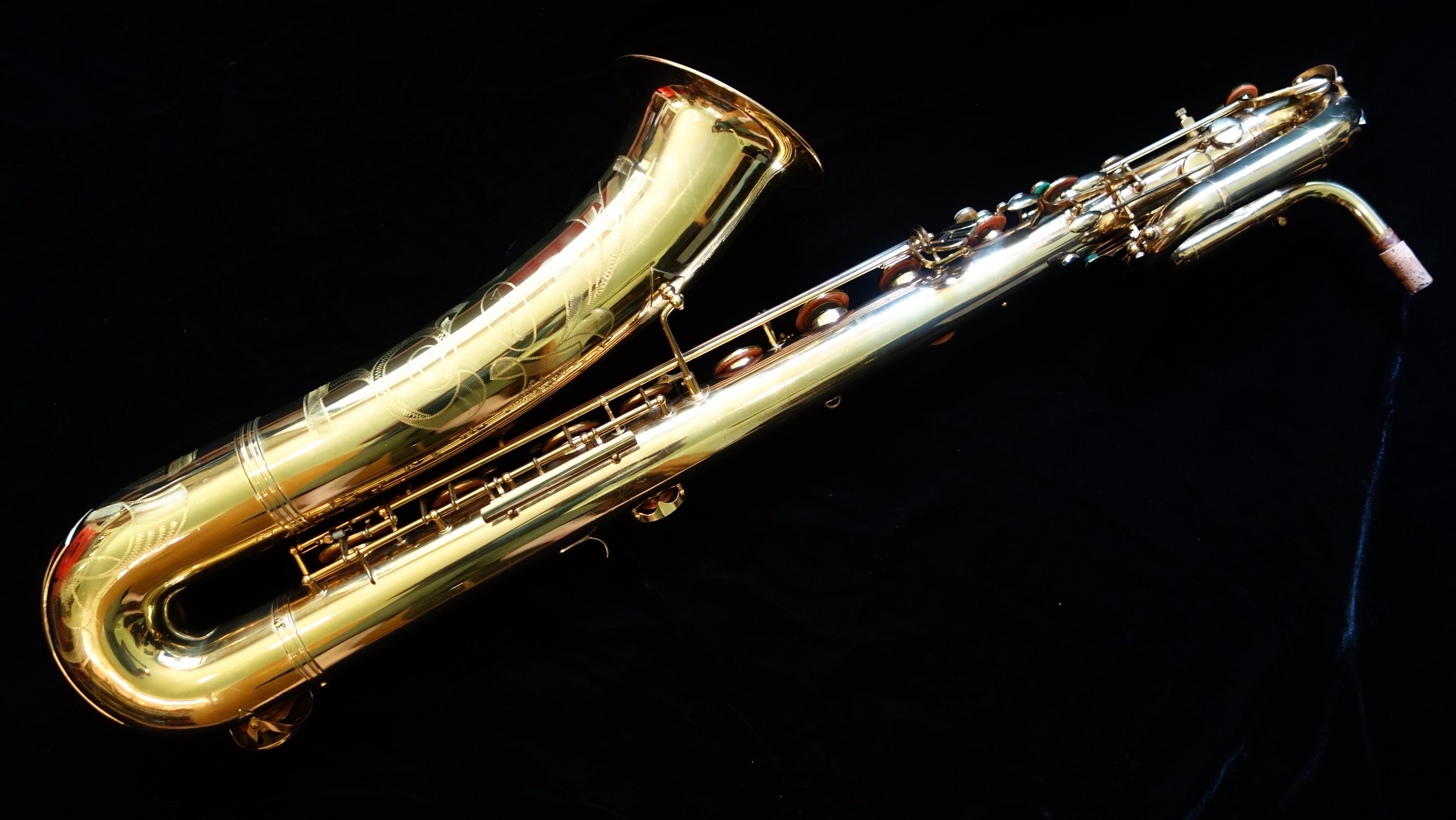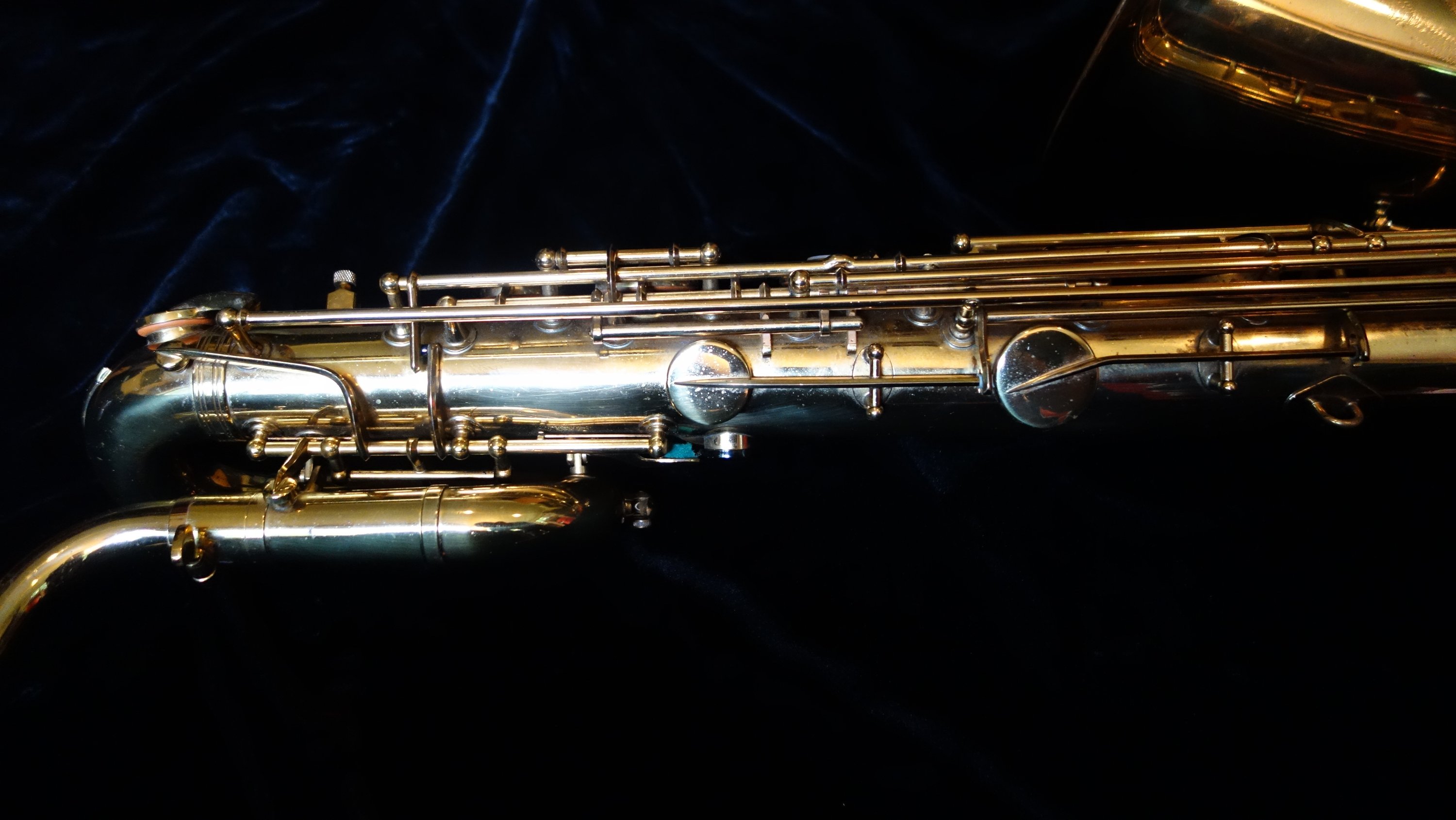 Before I realized my main love was alto, I spent a long time looking for a good, affordable baritone, and this was the horn I chose. It came to me with almost all of its original pads with the exception of two palm pads. Over the year that I have owned this horn I have worked on the horn piecemeal until now it plays extremely well on all of the original pads it came with and I replaced the two non-original palm pads with pads and resonators that match the original flat metal resonators. Usually I only sell horns that I have overhauled, but given that it plays so well on its original pads- which is a desirable feature for a collector- I can sell this horn either as-is or with a fresh overhaul.