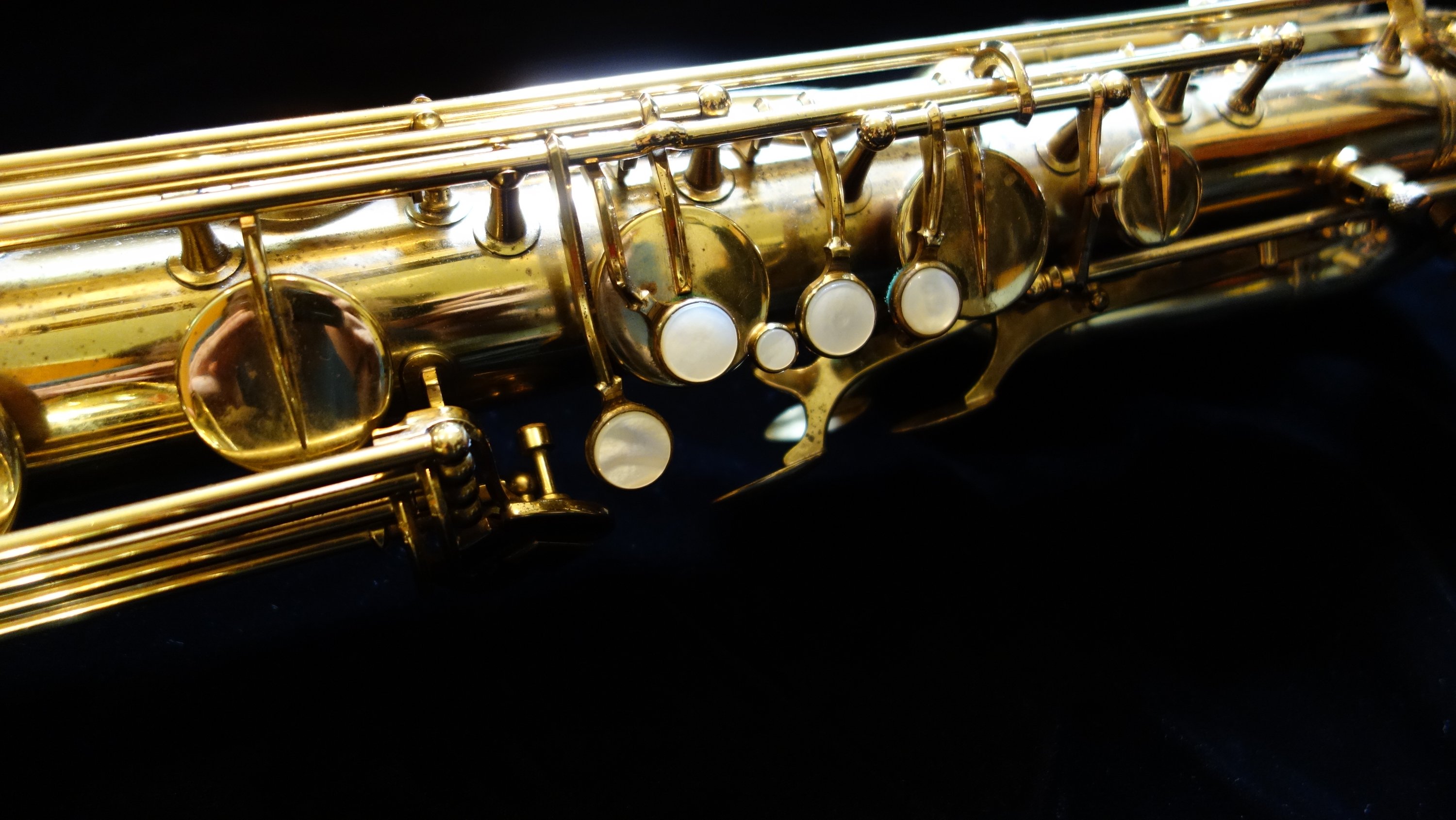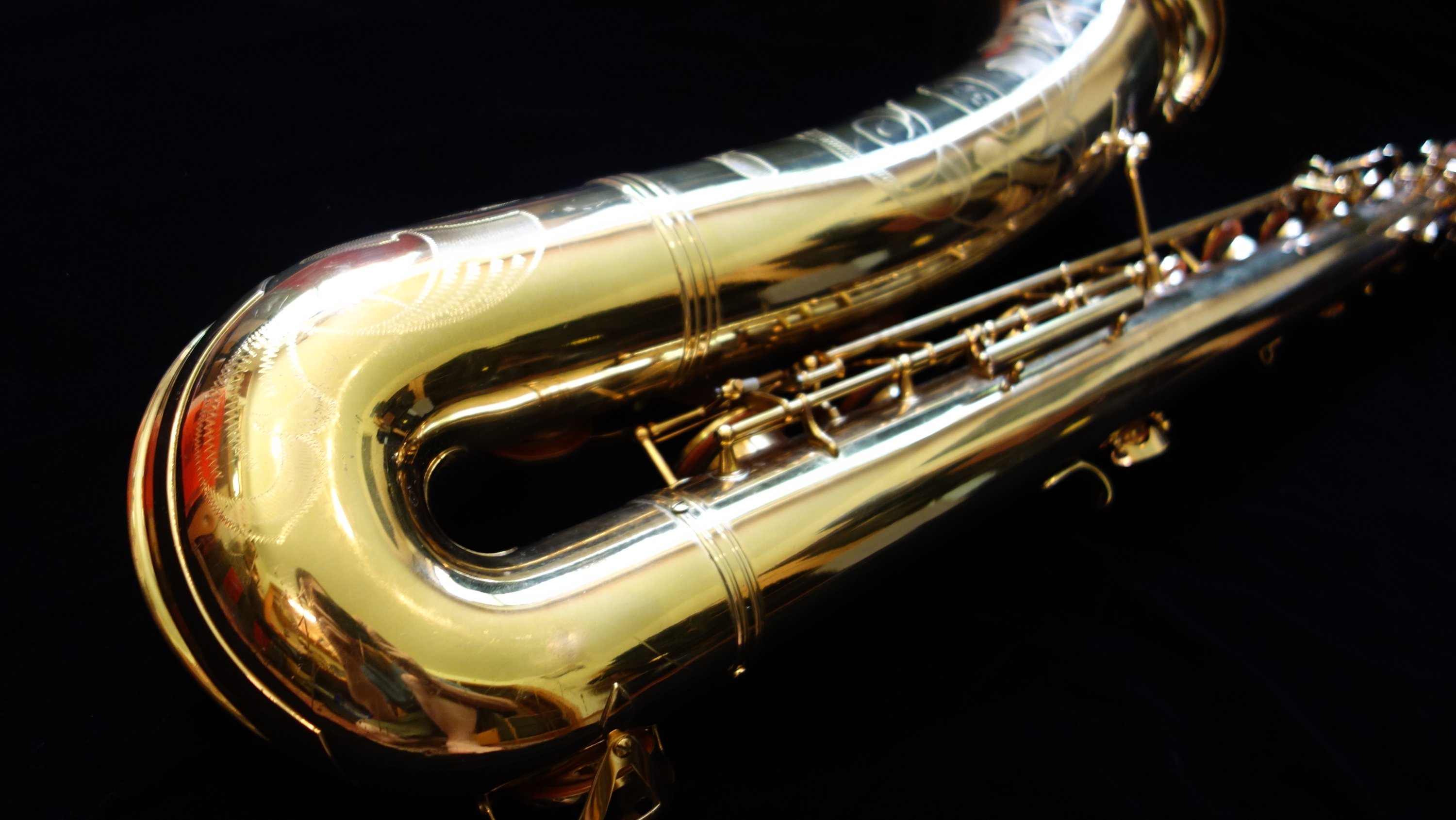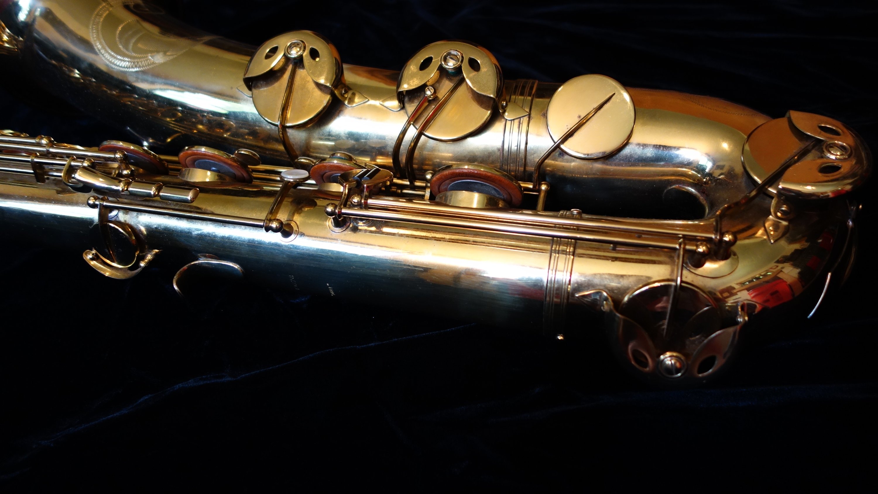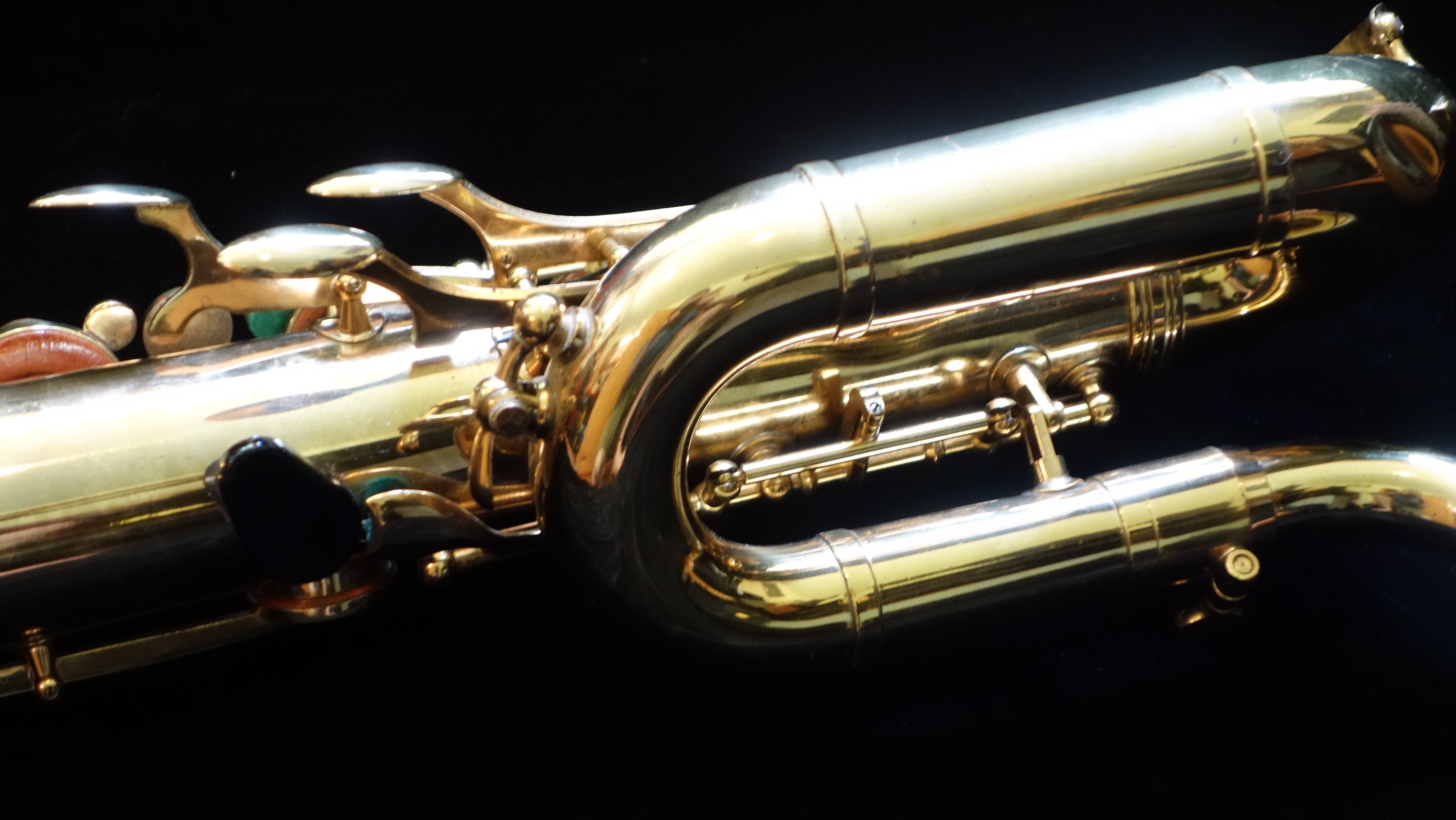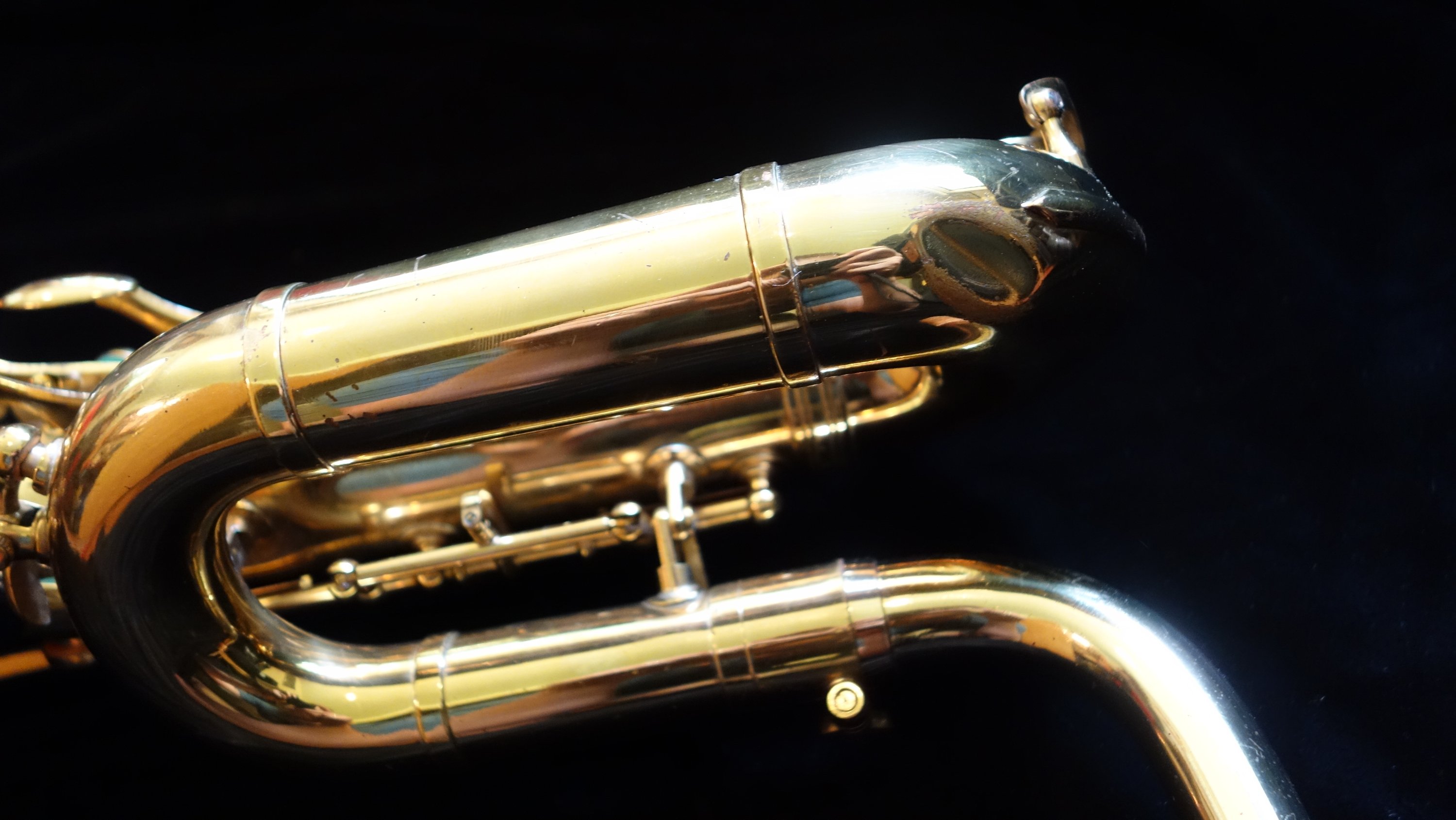 This saxophone has one flaw- a small dent on the top turn. It is in a difficult-to-access location for dentwork, so as of yet I have not attempted a fix. The top turn may need to be unsoldered to get the dent completely removed, but it could be improved and possibly (depending on how lucky I am that day) come all the way out without needing to be unsoldered. If you would like to purchase this horn, you can direct me to leave it as-is or try to remove it- either with or without unsoldering the top turn to get to it. Your call, and we can talk about at length during the purchasing process.