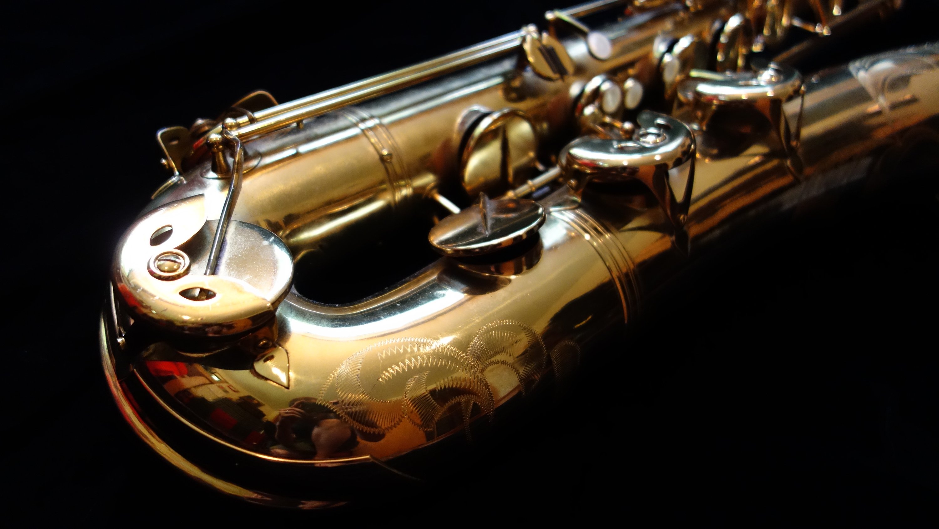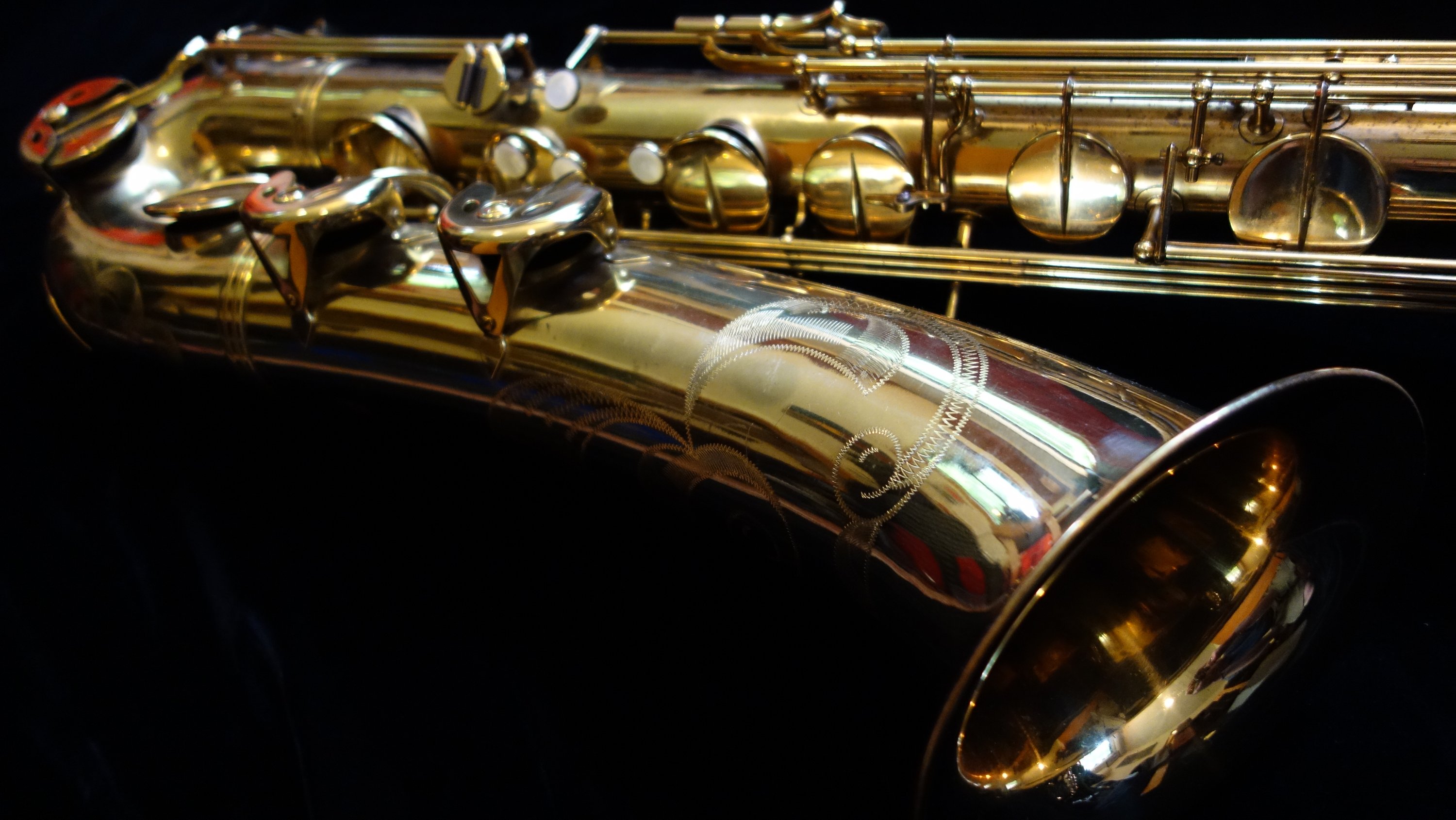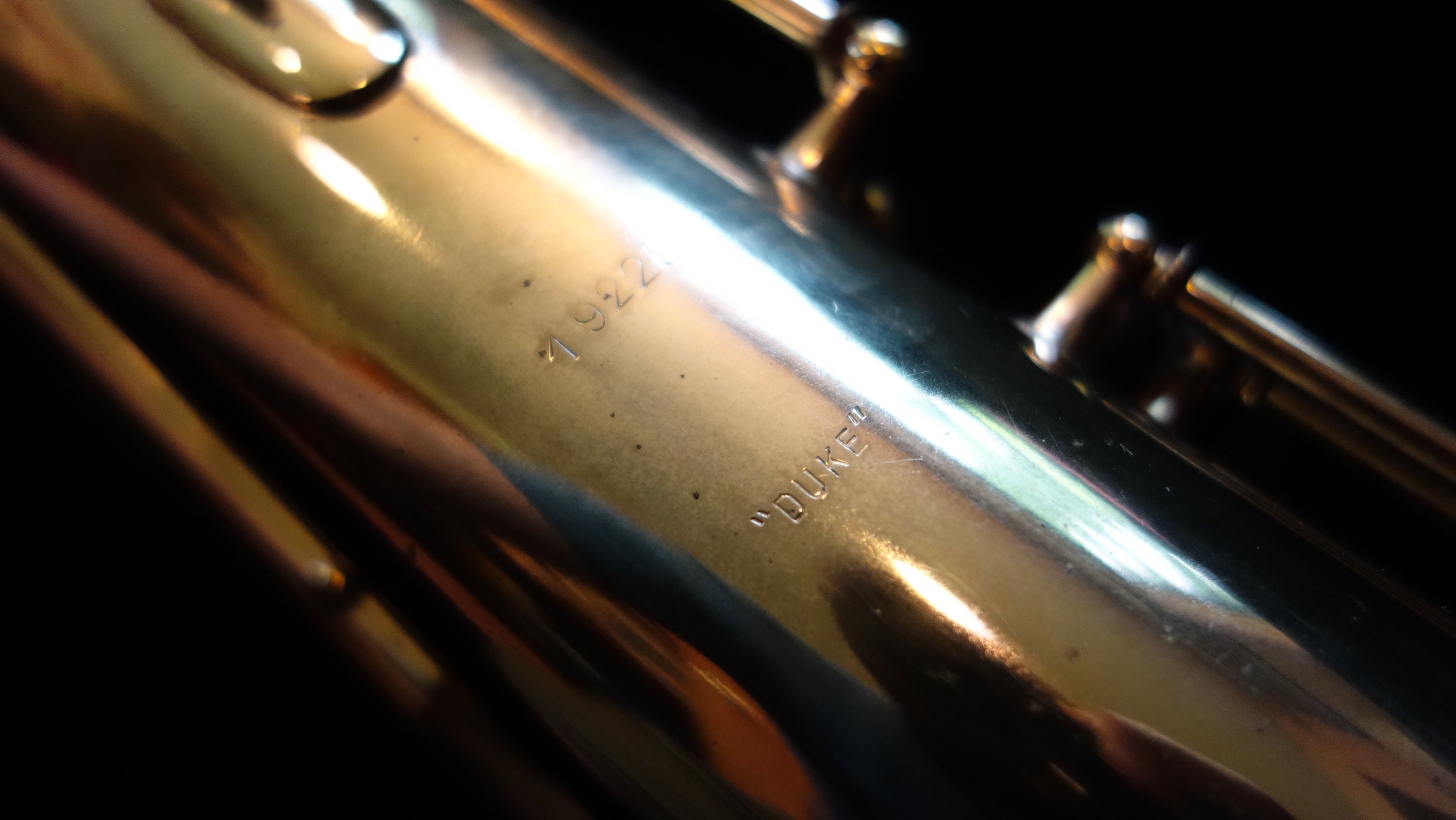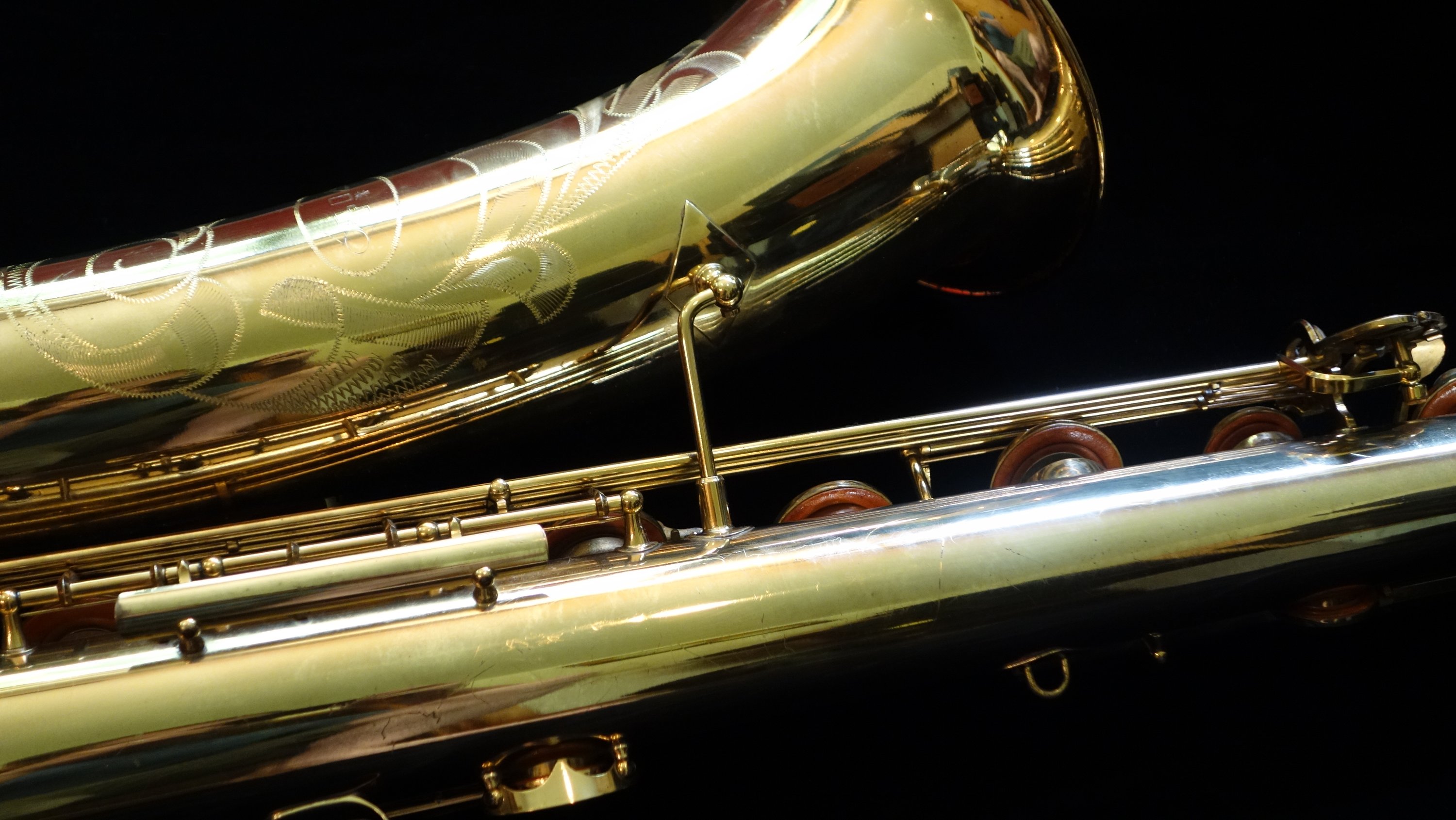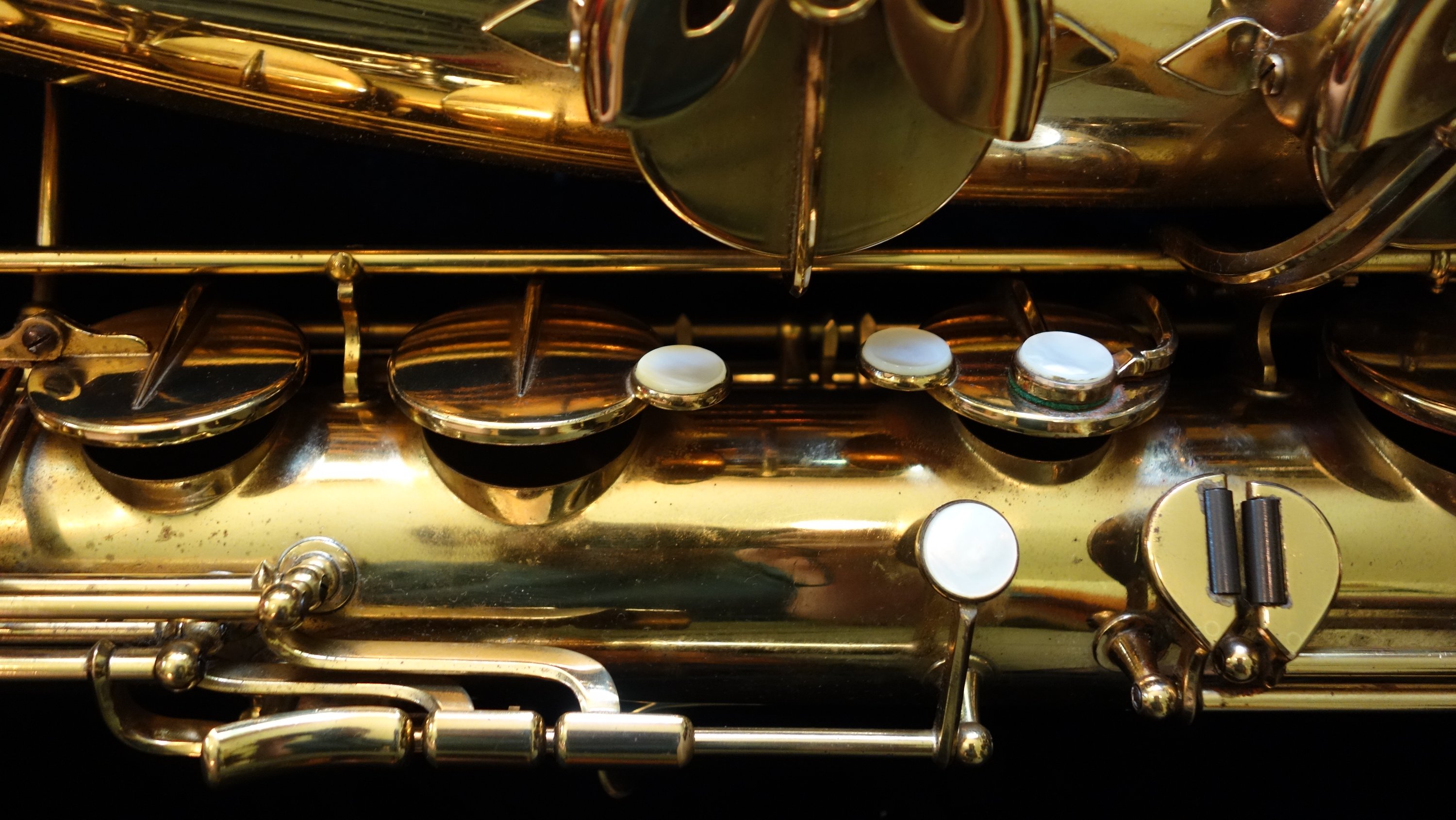 This saxophone has one flaw- a small dent on the top turn. It is in a difficult-to-access location for dentwork, so as of yet I have not attempted a fix. The top turn may need to be unsoldered to get the dent completely removed, but it could be improved and possibly (depending on how lucky I am that day) come all the way out without needing to be unsoldered. If you would like to purchase this horn, you can direct me to leave it as-is or try to remove it- either with or without unsoldering the top turn to get to it. Your call, and we can talk about at length during the purchasing process.